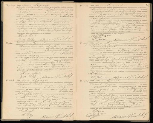 No. 1219 Heden twee Maart. negentienhonderd zes en twintig verschenen voor mij Ambtenaar van den burgerlijken stand van Amsterdam: homas van der Meulen van beroep zonder oud achtenzestig jaren, wonende alhier. en Jacobus de Wit van beroep zonder oud negenenvijftig jaren wonende alhier een dezer de varurd, dat of des na middags ten vijf ure, in de gemeente Amsterdam is overleden Zijs ten Napel, zonder beroep,, wonende alhier oud vierenzestig jaar, geboren te overeest, echtgenoote van Jacobus Walgrane weduwe van Adrianus Cornelis Lieverts, dochter van Klaas ten Napel en Antje de Vries, beiden overleden Waarvan akte, welke overeenkomstig de wet is voorgelezen. Th vd Meuler Mnd Kthef. J de Wus No. 1225 Heden drie Maart. negentienhonderd zes en twintig verschenen voor mij Ambtenaar van den burgerlijken stand van Amsterdam stephanus Huyng van beroep aanspreker, oud vierendertig jaren, wonende alhier, en Pehus Amsen van beroep aampreker, oud achten dertig Jaren wonende alhier, die verklaarden, dat op len dezer des voor middags ten een ure, in de gemeente Amsterdam is overleden Jan Pantuus, zonder groep,, wonende te Hilversum — oud vijf entachtig jaren, geboren te Leeuwarden, weduwnaar van Berber Atjes zoon van Pieter Ianhuis en Renske Kransen, beiden overleden Waarvan akte, welke overeenkomstig de wet is voorgelezen. Huiing Cund Kuthef Smsem No. 1221. Heden twee Maart negentienhonderd zes en twintig verschenen voor mij Ambtenaar van den burgerlijken stand van Amsterdam: Thomas van der Meulen van beroep zonder, oud achtenzestig jaren, wonende alhier, en Jacobus de Wit van beroep zonder oud negenenvijftig jaren, wonende alhier. die vverklaarden, dat op een dezer des na middags ten half vier- ure, in de gemeente Amsterdam is overleden arinus van Damme zonder beroep, wonende alhier, oud vier en zeventig jaars geboren te Zierik zee„ weduwnaar eerst van Barendina- Meijner, daarna van Hendrika de Vries, zoon van Florus van Damme en Lina Oldendorp beiden overleden. Waarvan akte, welke overeenkomstig de wet is voorgelezen.- Jh vd Menler Cuns Kerttf. J de Wik No. 1227 Heden drie Maart negentienhonderd zes en twintig verschenen voor mij Ambtenaar van den burgerlijken stand van Amsterdam LouisLatance, van beroep aan spreker, oud vierentwintig jaren, wonende alhier, en Hans Johansen, van beroep aanspreker, oud twee enveertig jaren wonende alhier die verklaarden, dat op een Maart des voor middags ten zeven ure, in de gemeente Amsterdam is overleden Cornelis Hubertus Posman van beroep werkman, wonende alhier, oud twintig jaren, geboren alhier, zoon van Petrus Adrianus Bosman timmerman, wonende alhier, en Magdalena Cornelia Flipsen, overleden Waarvan akte, welke overeenkomstig de wet is voorgelezen. R Lasanie H. Johansen Guud Kukhef. No. 1223 Heden twee Maart negentienhonderd zes en twintig verschenen voor mij Ambtenaar van den burgerlijken stand van Amsterdam: imanuel Zudel, van beroep bode oud achtenzeventig jaren, wonende alhier, en Simon Bonn van beroep bode, oud eenenvijftig jaren wonende alhier, die verklaarden, dat op een Maart des na middags ten half negen ure, in de gemeente Amsterdam is overleden Plorette Meijers. zonder beroep, wonende alhier — oud drie en tachtig jaren, geboren te Lienwarden weduwe van Leon Abraham Levie dochter van Meijer Gabiiel Meijers, en Nette Hessel Drielsma, beiden overleden. Waarvan akte, welke overeenkomstig de wet is voorgelezen. E Indel D Bons Jun Kuthef No. 1229 9 Heden drie Maart negentienhonderd zes en twintig verschenen voor mij Ambtenaar van den burgerlijken stand van Amsterdam: Frederik Reijser, van beroep aanspieker, oud zevenenveertig jaren, wonende alhier. en Frits Keijser, van beroep bode oud twee en twintig jaren wonende alhier, een dezer, de versaardn de of des voor mddags ten haff twee ure,, in de gemeente Amsterdam is overlede, Hendrik Oosterhuis van beroep schuitevoerder, wonende alhier oud vijf enzestig jaren, geboren te Ttroobos, echtgenoot van Grietje Boon, zoon van Elias Oosterhuis en Juliana Bosman, beiden overleden Waarvan akte, welke overeenkomstig de wet is voorgelezen. F Reijser cenm Kuthef AKer