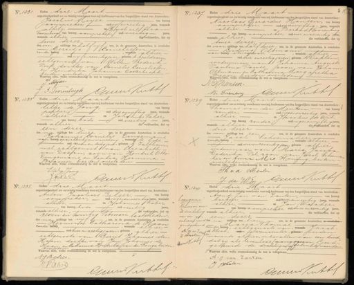 No. 1231. Heden drie Maart. negentienhonderd zes en twintig verschenen voor mij Ambtenaar van den burgerlijken stand van Amsterdam, Jacobus Neijer, van beroep aanspreker, oud vijf enzestig jaren, wonende alhier en Gijsbert Abram Voorenburgh van beroep aanspreker oud veertig jaren, wonende alhier.— die verklaarden, dat op — twee dezer des van middags ten half vijf ure, in de gemeente Amsterdam is overleden Gerritje Corneusten zonder beroep, wonende alhier, oud vijfenzeventigjaar, geboren te Hheldoorn echtgenoote van -1 Willem Frederik Put, dochter van Cornelis Cornelissen, en Hendrika Johanna Oosterbroek; beiden overleden/ Waarvan akte, welke overeenkomstig de wet is voorgelezen. J Mlije ins Kuthf. A. Voorenburgh No. 1237 Heden drie Maart. negentienhonderd zes en twintig verschenen voor mij Ambtenaar van den burgerlijken stand van Amsterdam Nicolaas Gerardus Kansen, van beroep aanspreker, oud vierenvijftig jaren, wonende alhier, en, Barend Boorenburg van beroep aanspreker, oud vier en zeventig jaren, wonende alhier, die verklaarden, dat op twee dezer, des voor middags ten half twee ure, in de gemeente Amsterdam is overlede Ludwig Oltmann van beroep stucadoor,, wonende alhier oud drie enzestig jaren, geboren te Dohlen weduwnaar van Johanna Auguste Paulina Pause zoon, van Johann Oltmann en Catharina Margaretha Pieper, beiden overleden Waarvanakte, welke overeenkomstig de wet is voorgelezen. N G HantenGeuerd Kuthef B. Torrenburg No. 1233 Heden drie Maart negentienhonderd zes en twintig verschenen voor mij Ambtenaar van den burgerlijken stand van Amsterdam: teltje de Jong, van beroep portier oud drieenvijftig jaren, wonende alhier, en Johannes Faber, van beroep bode, oud veertig jaren, wonende alhier, die verklaarden, dat op len dezer des na middags ten twee ure, in de gemeente Amsterdam is overleden Johannes Cornelis Dingemans van beroep opzichter bij een wasscherij, wonende, te Ede. oud zeven en dertig jaar, geboren te zaltbommel, echtgenoot van Elisabethvan Doorn, zoon van Hendrik Otto Dingemans en Sophia Hermina Bramer beiden overleden. Waarvan akte, welke overeenkomstig de wet is voorgelezen. EWa Jong ruur Kuthf. J JZV No. 1239 Heden drie Maart negentienhonderd zes en twintig verschenen voor mij Ambtenaar van den burgerlijken stand van Amsterdam; Thomas van der Meuken van beroep zonder oud negenenzestig Jaren, wonende alhier, en Jacobus de Wit van beroep zonder oudnegenenvijftig Jaren, wonende alhier die verklaarden, dat op drie dezer des voor middags ten een ure, in de gemeente Amsterdam is overleden Jacob Schoemaker zonder geroep, wonende alhier oud vierenzeventig jaar, geboren alhier weduwnaar van Maria Jacoba Dederika Pel, zoon van Jacob Schoema ker en Arma Mie Honing, beidenoverleden. Waarvan akte, welke overeenkomstig de wet is voorgelezen. Sh vd Meulen Guund Kukhf J de We No. 1235 Heden drie Maart negentienhonderd zes en twintig verschenen voor mij Ambtenaar van den burgerlijken stand van Amsterdam: Anton Jacobus Belser, van beroep aanspreker, oud negenenveertig jaren, wonende alhier, en aJohannes Taber, van beroep bode oud veertig jaren, wonende alhier,dae verklaarden, dat op zeven en twintig Februari laatstleden des na middags ten vijt ure, in de gemeente Amsterdam is overleden Hermina Catharina de aanzonder beroep,, wonende alhier oud twee en zestig jaren, geboren alhier,echtgenoote van Gerrit Johannes deHaan, dochter van Jan Johannes de Haan en Catharina Hendrika van der Lange, beidenoverleden. Waarvan akte, welke overeenkomstig de wet is voorgelezen. AJ. Bebrei. Jab Cnd Kerthef. No. 1241. /aangeven Renvooi en de doorhaling van een geschreven woord goedgekeurd; A. J. v. Zenf Jwicker 1r Gun Kotbef. 49n Heden drie Maart negentienhonderd zes en twintig verschenen voor mij Ambtenaar van den burgerlijken stand van Amsterdam, Arend-Jan van Lanten, van beroep barbier, oud zevenenveertig jaren, wonende alhier, en Jan Wacker, van beroep aanpreker, oud twee enzeventig jaren wonende alhier, die verklaarden, dat op een dezer ddes na middags ten tien ure, in de gemeente Amsterdam is overleden zonder beroep, echtgenoote van, wonende Jacob. Maria Thomas, de kloet, oud glazenwasscher, geboren beiden 1e wonende alhier, is bevallen van een kind dat zij als levenloos jaangegeen; Goed geteurd de doorhalingvan vijf gedrukte woorden Waarvan akte, welke overeenkomstig de wet is voorgelezen. A: J: van Zanten J Wiiker Cnn Kuttef