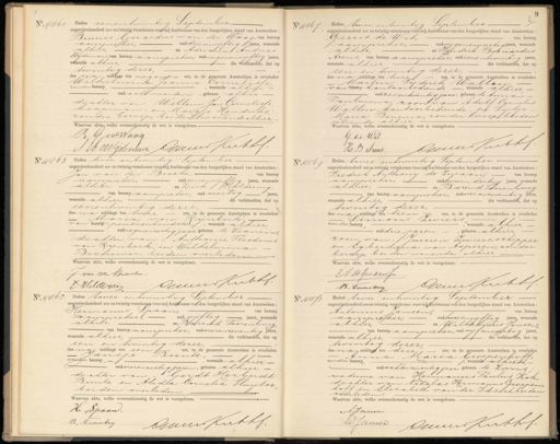 No. 4861 Heden eenentwintig September. negentienhonderd zes en twintig verschenen voor mij Ambtenaar van den burgerlijken stand van Amsterdam: Brunis Gerardus van der Waag, van beroep aanspreker, oud drieenvijftig Jaren, wonende alhier, en Adrianus Andreas Wijdemans van beroep aanspieker, oud negenenvijftig jaren wonende alhier, die verklaarden, dat op twintig dezer, des na middags ten negen ure, in de gemeente Amsterdam is overleden Wilhelmima Jeanne Cornelisse, zonder beroep,, wonende alhier oud acht maanden, geboren alhier, dochter van Willem Jan Cornelisse koopman, en Margje Hendriks, zonder beroep, beiden wonende alhier. Waarvan akte, welke overeenkomstig de wet is voorgelezen.B. G. vd Waag A Hb WWijdenars Cawd Kerthef. No. 4867 Heden twee entwintig September. negentienhonderd zes en twintig verschenen voor mij Ambtenaar van den burgerlijken stand van Amsterdam: Gerrit de Wit, van beroep aanpreker, oud negenenveertig Jaren, wonende alhier, en Hendrik Bernardus Arens, van beroep aampreker, oud eenentwintig Jaren, wonende alhier die verklaarden, dat of een en twintig dezer des na middags ten twee ure, in de gemeente Amsterdam is overleden Martin Frederik Wallin van deroep kantoorbediende, wonende alhier oud zes entwintig jaar, geboren te Anna Paularona, zoon van Adalf Cornelis Wallin, kantoorbediende, en Pijtje Maria Benema, zonder beroep beiden wonende alhier. Waarvan akte, welke overeenkomstig de wet is voorgelezen. G. de Wit Cauwd Kuthef. H.B. Arens No 4863 Heden twee entwintig September negentienhonderd zes en twintig verschenen voor mij Ambtenaar van den burgerlijken stand van Amsterdam: Jan van den Broeke, van beroep aanspreker, oud eenenvijftig jaren, wonende alhier. en Dirk Hildering van beroep aanspeker, oud veertig jaren, wonendealhier, die verklaarden, dat op eenentwintig dezer des na middags ten wel ure, in de gemeente Amsterdam is overleden Maria van Rijnberk, van beroep pensionhoudster,, wonende alhier, oud negenenzestig jaar geboren te Vianen, dochter van - Anthonie Theodorus van Rijnberk, en WilhelmmaBrouwer, beiden overleden Waarvan akte, welke overeenkomstig de wet is voorgelezen. J ver dn Broche. Eeuuerd Kuthf. C Hildering No. 4869. Heden twee entwintig September negentienhonderd zes en twintig verschenen voor mij Ambtenaar van den burgerlijken stand van Amsterdam Fredrik Anthonij de Zwaan, van beroep aanspreker, oud tweeen dertig Jaren, wonende alhier, en Barend Joorenburg van beroep aanspreker, oud vier enzeventig Jaren wonende alhier, die verklaarden, dat op twintig dezer, des na mmiddags ten tien ure, in de gemeente Amsterdam is overleden Simon Zwiers zonder beroep,, wonende alhier, — oud drie jaren, geboren alhier, zoon van- Jurrien Zwiers, schipper en Egberdiena van Asperen, zonder beroep, berden wonende alhier. Waarvan akte, welke overeenkomstig de wet is voorgelezen. JA: de ZnaanJr rur Kukhf. Nr. Taerbug No. 4865 5. Heden twee entwintig September negentienhonderd zes en twintig verschenen voor mij Ambtenaar van den burgerlijken stand van Amsterdam: Hermanus Spaan, van beroep aanspreker oud vijftig jaren, wonende alhier, en Barend Toorenburg, van beroep aanspreker, oud vierenzeventig Jaren, wonende alhier, die verklaarden, dat o een en twintig dezer, des na middags ten een ure, in de gemeente Amsterdam is overleden Jansje Sunte zonder beroep,, wonende alhier, oud vierenzestig jaren, geboren alhier, dochter van - Gerdt Herberdt Bunte en Alida Cornelia Sluijter beiden overleden Waarvan akte, welke overeenkomstig de wet is voorgelezen. H. Spaan. B Drorenbug Cnmputhf. No. 4871. Heden twee en twintig September negentienhonderd zes en twintig verschenen voor mij Kmbtenaar van den burgerlijken stand van Amsterdam: Antonius Jansen, van beroep aanspreker, oud tweeenvijftig jaren, wonende alhier, en Wilhelmus Jansen, van beroep aanpreker, oud vijfenveertig jaren die verklaarden, dat of wonende alhier twintig dezer des na uiddags ten drie ure, in de gemeente Amsterdam is overlede nna Maria Groepenhoff zonder beroep,, wonende alhier oud achtenzeventig jaar, geboren te zons weduwe van Hermanus Paulus Kok, dochter van Nicolas Hermanus Groepen hoff en Elisabeth van der Idsert, beiden overleden. Waarvan akte, welke overeenkomstig de wet is voorgelezen. A Jansen W. Jansen Cnmr Kuthf.