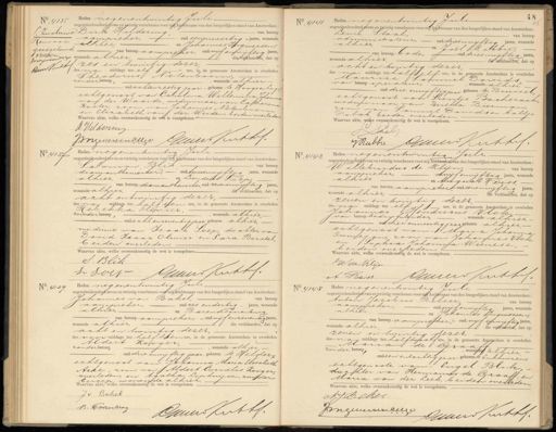 No. 4135 ¶„Zwaluwe Renvooi goedgekeurd. Brilderinige myjueven d Koto. Heden negenentwintig Juli- negentienhonderd Zeven en twintig verschenen voor mij Ambtenaar van den burgerlijken stand van Amsterdam, Dirk Hildering, van beroep aanpreker, oud eenenveertig jaren, wonende alhier, en Johannes Ingwersen, d. van beroep aanmeker, oud vijfenvijftig jaren, wonende alhier, des na middags ten elf ure, in de gemeente Amsterdam is overleden die verklaarden, dat op J. zes en twintig dezer Theodorus Notenboom. zonder beroep,, wonende alhier. -oud achtenzestig jaar, geboren te Hoogeen Lage echtgenoot van Carolina Willemina Johanna van der Waarde, weduwnaar van Catharina Koster, zoon van Johannes Notenboom en Elizabeth van der Weiden, beiden overleden Waarvan akte, welke overeenkomstig de wet is voorgelezen. D: Hildering J:Igevers en Ellge Geuns Kethf. No. 4141. Heden negenentwintig Ju negentienhonderd zeven en twintig verschenen voormfj Ambtenaar van den burgerlijken stand van Amsterdam: Levie staal, van beroep adninnistrateur, oud drieënvijftig jaren, wonende alhier, en Joel Rabbie, van beroep bode, oud drieenvijftig jaren wonende alhier, die verklaarden, dat op acht en twintig dezer des na middags ten half elf ure, in de gemeente Amsterdam is overleden Maurice Sammel Dareid van beroep operaleur, wonende alhier oud drie envijftig jaar geboren te Brussel, echtgenoot van Lientje Bacherach, weduwnaar van Bertha Bierman zoon van Sammel Davids en Aaltje Polak, beiden overleden. Waarvan akte, welke overeenkomstig de wet is voorgelezen. Saal Rubbe Geuerd Kerthef. No 4137 Heden negenentwintig Juli negentienhonderd Zeven en twintig verschenen voor mij Abtenaar van den burgerlijken stand van Amsterdam: Salomon Blik van beroep diamantbewerker, oud tweeenvijftig Jaren, wonende alhier, op Leendent Toep, van beroep diamantbewerker, oud zevenenvijftig jaren wonende alhier die verklaarden, dat op acht entwintig dezer, des na middags ten half een ure, in de gemeente Amsterdam is overleden Reb ekka Olivier, zonder beroep,, wonende alhier, — oud acht enzeventig jaar geboren alhier, weduwe van Isaac Soep, dochter van David Isaac Olwier en Sara Borstel, beiden overleden. Waarvan akte, welke overeenkomstig de wet is voorgelezen- S: Blik Ceus Kerktf L Set No. 4143. Heden negenentwintig Juli negentienhonderd zeven en twintig verschenen voor mij Ambtenaar van den burgerlijken stand van Amsterdam: Willebroudus de Klijn, van beroep aangueker, oud vijf envijftig jaren, wonende alhier en August Peiss van beroep aanpreker oud eenenvijftig jaren wonende alhier die verklaarden, dat op zeven en twintig dezer des na middags ten elf ul ure, in de gemeente Amsterdam iis overleden Johannes Hendricus Vlok van beroep bedrijfsteider,, wonende alhier, oud vier enveertig jaar geboren alhier, echtgenoot van - Maria Johanna Onnejan, zoon van Johannes Vlok en / Paphia Johanna Wienese, beiden overleden Waarvan akte, welke overeenkomstig de wet is voorgelezen. WW de Klijn lend Kuthef. A. Rerss. No 4139 Heden negenentwintig Juli negentienhonderd zeven en twintig verschenen voor mijAmbtenaar van den burgerlijken stand van Amsterdam: Johannes van Bakel, van beroep aanmeker, oud zes endertig Jaren, wonende alhier, en Barend Poorenburg van beroep aammeker,- oud vijf enzeventig Jaren, wonende alhier, die verklaarden, dat op acht en twintig dezer, des voor middags ten halfden ure, in de gemeente Amsterdam is overleden Aldert Kooger,, wonende alhier zonder beroep oud drieenvijftig jaar, geboren te Helder echtgenoot van Johanna Maria Elisabeth Arke, zoon van Aldert Cornelis Kooger, overleden, en Agatha Liphuijsen, zonder beroep, wonende alhier. Waarvan akte, welke overeenkomstig de wet is voorgelezen. Jv Bakel B. Duozenberg Cuurs Kubbj. No. 4145 Heden negenentwintig Juli negentienhonderd zeven entwintig verschenen voormed Ambttenaar van den burgerlijken stand van Amsterdam Anton Jacobus Belser van beroep aanspreker, oud vijfenvijftig jaren, wonende alhier, ep Johannes Ingwversen, van beroep aanpreker, oud vijf envijftig Jaren wonende alhier, die verklaarden, dat op zeven en twintig dezer, des na middags ten halftwaalf ure, in de gemeente Amsterdam is overleden Maria de Graa zonder beroep,, wonende alhier oud een entachtig jaar, geboren te Enkhuizen, echtgenoote van- Engel Blok dochter van Hermanus de Graaff, er Maria van der Leek, beiden overleden Waarvan akte, welke overeenkomstig de wet is voorgelezen. AJ Beser. ongeversen Eeege Gers Kerthf.