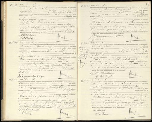 No 2497 Heden tien Mei negentienhonderd twee en dertig verschenen voor mij Ambtenaar van den burgerlijken stand van Amsterdam, Anton Jacobus Belser van beroep aanspreker oud vijfenviftig jaren, wonende en Piet Bakker, alhier van beroep aanspreker oud tweeenvijftig jaren, wonende alhier de verklaarden, dat op negen dezer des voor middags ten zeven ure, in de gemeente Amsterdam is overleden Sijtske Wiersma zonder beroep, wonende alhier oud vijfendertig jaren-, geboren te Won„ seradeel, echtgenoote van Jan Reitsma dochter van urens Wiersma en Akke Reinhart, beiden zonder beroep en wonende te 't Bildt Waarvan akte, welke overeenkomstig de wet is voorgelezen. A J Beker Jmanf P Bakker No 250 5 Heden tien Mei negentienhonderd twee en dertig verschenen voor mij Ambtenaar van den burgerlijken stand van Amsterdam: Joannes Petrus Pendavingh van beroep aanspreker oud vierenveertig Jaren, wonende alhier en Johannes Dinkla van beroep aanspieker oud tweeenvijftig jaren wonende alhier negen dezer de vterdn, det of des voor middags ten vif ure, in de gemeente Amsterdam is overleden Joannes Hieronymus Timmermans zonder beroep, wonende alhier„ oud zeventig jaren, geboren te Maas trecht weduwnaar van Anna Elisabeth Geudeker, zoon van Hieronymus Timmer mans en Gesina Blanke, beiden overleden Waarvan akte, welke overeenkomstig de wet is voorgelezen. W Penvoorn veer Jment J Dinkla No 2499 Heden tien Mei negentienhonderd twee en dertig verschenen voor mij Ambtenaar van den burgerlijken stand van Amsterdam: Bernardus Geestman, van beroep aanspreker oud zesendertig jaren, wonende alhier op Johannes Ingeversen van beroep aanspreker oud zestig jaren wonende alhier negen dezer— J vendrden det of des voor middags ten twee ure, in de gemeente Amsterdam is overleden Hermanus Josephus Woons zonder beroep, wonende alhier - oud veertien maande: geboren alhier zoon van Hermanus Josephus Woons metaalbewerker en Theddora Aafje Verdouw zonder beroep, beiden wonende alhier Waarvan akte, welke overeenkomstig de wet is voorgelezen. B. Geertman. Prmf J: Wguersen Ellje. No 2505 Goedgekeurd van vijf geduikte woorden Parnkeensen Pemen Heden tien Mei negentienhonderd twee en dertig verschenen voor mij Ambtenaar van den burgerlijken stand van Amsterdam: Cornelis Heere, van beroep aanspeeker oud eenenzestig - jaren, wonende 7 alhier en Gijsbert Voorenburgh van beroep aanspreker oud tweeen zeventig Jaren wonende alhier die verklaarden, dat op acht dezer des na middags ten vier ure, in de gemeente Amsterdam is overleden Johanna Blootshoofd nder beroep echtgenoote van-, wonende Johannes Frederikus s Sluijter, handelseizigen geboren beiden wonende alhier is bevallen van een kind dat zy als levenloos aangeven. Waarvan akte, welke overeenkomstig de wet is voorgelezen. den Heersen 1 Jremt G Voorenburgh No 2501 Heden tien Mei negentienhonderd twee en dertig verschenen voor mij Ambtenaar van den burgerlijken stand van Amsterdam: Marinus van Bokkum van beroep aanspieker oud drieenvijftig Jaren, wonende en Jacobus Tang.- alhier van beroep aanspreker oud achtenzestig jaren wonende alhier de verklaarden, dat op negen dezer des ina middags ten een ure, in de gemeente Amsterdam is overleden Henricus Johannes Smit zouder beroep, wonende alhier oud vijfenzeventig jaren-, geboren alhier weduwnaar eerst van Sijtske Stok daarna van Maria Henriette Mathilda van Valkenburg zoon van Johannes Jacobus Smit en Catharina Elizabeth Hellendaorn Waarvan akte, welke overeenkomstig de wet is voorgelezen. beiden overleden Wv Bokheer T Vrng Jremans No. 2507 Heden tien Mei negentienhonderd twee en dertig verschenen voor mij Ambtenaar van den burgerlijken stand van Amsterdam: Adriaan Albert van Mourik van beroep aanspreker oud eenenveertig Jaren, wonende alhier ep Wijbe de Haan van beroep aanspreker oud tweeenzeventig Jaren wonende alhier die verklaarden, dat op acht dezer des na middags ten half tien ure, in de gemeente Amsterdam is overleden Wilhelmus Albertus van der Linden zonder beroep, wonende alhier oud drie jaren geboren alhier zoon van Wilhelmus Albertus van der hinden betonwerker en Maria Johanna Lodder zonder beroep beiden wonende alhier Waarvan akte, welke overeenkomstig de wet is voorgelezen. Ga vMvurik Jman x W de Haan