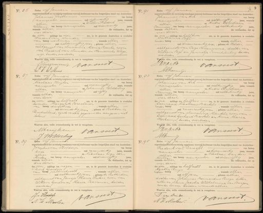 No. 85 Heden vijf Januari negentienhonderd zes en twintig verschenen voor mij Ambtenaar van den burgerlijken stand van Amsterdam: Johannes Posthumus van beroep aanspreker oud vijfenveertig jaren, wonende alhier. en Willem Frederik Willems van beroep aanspreker oud zesenzeventig jaren wonende alhier, die verklaarden, dat op vier dezer des voor middags ten vier ure, in de gemeente Amsterdam is overleden Freterik van Sunder van beroep werkman, wonende alhier oud achtenvijftig jaren, geboren alhier echtgenoot van Susanna Maria Roeske, zoon van Frederik van Sunder en Hendrrika Wegewijs, beiden overleden. Waarvan akte, welke overeenkomstig de wet is voorgelezen. Hormmmus vansoest WF: Willems No. 91 Heden vijf Januari negentienhonderd zes en twintig verschenen voor mij Ambtenaar van den burgerlijken stand van Amsterdam: van beroep Johannes van Ark aanspreker oud achtenvijftig jaren, wonende alhier en Andre Christiaan Rammeijer, van beroep aanspreker oud achtentwintig jaren wonende alhier, vier dezer de verklaarden, dat op des na ,middags ten half twee ure, in de gemeente Amsterdam is overleden Catharina Bijl zonder beroep, wonende alhier oud drieenzeventig jaren, geboren te Helder, echtgenoote van Oege Breeuwsma, dochter van Willem Bijl en Jannetje Kwinkelenberg, beiden overleden.— Waarvan akte, welke overeenkomstig de wet is voorgelezen Janarkw vansoest rans No. 87 Heden vijf Januari negentienhonderd zes en twintig verschenen voor mij Ambtenaar van den burgerlijken stand van Amsterdam: van beroep Nicolaas Kuijken— aanspreker oud vierenvijftig jaren, wonende alhier, en Johannes Volderling van beroep aanspreker oud vijftig jaren, die verklaarden, dat op wonende alhier vier dezer des voor middags ten half acht ure, in de gemeente Amsterdam is overleden bevonden: Margarete Breslaner van beroep dienstbode, wonende alhier oud eenendertig jaren, geboren te Ratibor in Duitschland, zijnde verdere gegevens den aangevers met bekend. Waarvan akte, welke overeenkomstig de wet is voorgelezen. Nuyjken Vansoest J. Volderling No. 93 Heden vijf Januari negentienhonderd zes en twintig verschenen voor mij Ambtenaar van den burgerlijken stand van Amsterdam, Johannes van Ark van beroep aanspreker oud achtenvijftig jaren, wonende alhier. en André Christiaan Rammeijer van beroep aanspreker oud achtentwintig jaren, wonende alhier. vier dezel de velkaarden det of — des na middags ten halfzes ure, in de gemeente Amsterdam is overleden Coenraad ticolaas Bartels zonder beroep, wonende -alhier, oud zesenzestig jaren, geboren- alhier, echtgenoot van Susanna Mantels, zoon van Coenraad Gerhard Bartels en Anna Maria Heikamp, beiden overleden. Waarvan akte, welke overeenkomstig de wet is voorgelezen. JanArkt Vansoest Altrumm No. 89 Haeden vijf Januari negentienhonderdzes en twintig verschenen voor mij Ambtenaar van den burgerlijken stand van Amsterdam: Jozephus van Vloodorp van beroep bode oud zesenveertig jaren, wonende alhier. en Nicolaas van der Moolen van beroep aanspreker oud drieenvijftig jaren 1 wonende alhier. die verklaarden, dat op drie dezer des voor, middags ten negen ure, in de gemeente Amsterdam is overleden Dirk Gordon van beroep pakhuisknecht, wonende alhier oud achtenveertig jaren, geboren te Rotterdam echtgenoot van Jansje Maria Pieters, zoon van Willem Gordon en Maria Karreman, beiden overleden Waarvan akte, welke overeenkomstig de wet is voorgelezen. van soert J. v. Vloodorp N v/ Moolen No. 95 Heden vijf Januari negentienhonderd zes en twintig verschenen voor mij Ambtenaar van den burgerlijken stand van Amsterdam: Frederik van Driessel van beroep aanspreker oud tweeenveertig jaren, wonende alhier en Nicolaas van der Moolen van beroep aanspreker oud drieenvijftig jaren wonende alhier, die verklaarden, dat op — vier dezer— des voor middags ten half acht ure, in de gemeente Amsterdam is overleden Agatha Ruys, wonende alhier zonder beroep oud elf jaren, geboren alhier dochter van Johannes Bernardus Ruys letter zetter en Stara Jacoba Wilhelmina van Bergen zonder beroep, beiden wonende alhier. Waarvan akte, welke overeenkomstig de wet is voorgelezen. I: van Din W. vansoest N v/d Moolen.