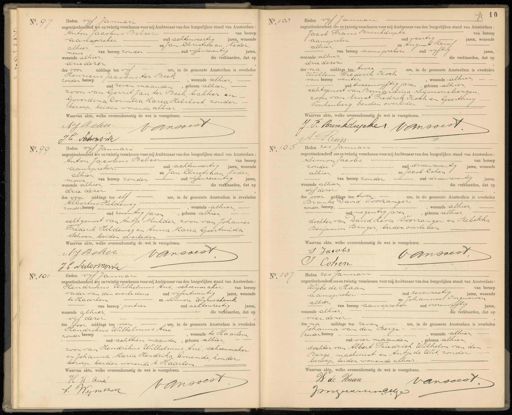 No. 97 Heden vijf Januari negentienhonderd zes en twintig verschenen voor mij Ambtenaar van den burgerlijken stand van Amsterdam: Anton Jacobus Belser van beroep aanspreker oud achtenveertig jaren, wonende alhier en Jan Christiaan Nedermorve van beroep zouder oud vijfenzeventig jaren wonende-alhier, die verklaarden, dat op drie dezer des voor middags ten vijf ure, in de gemeente Amsterdam is overleden Henricus Jacobus ter Beek zonder beroep, wonende alhier, oud zeven maanden, geboren -alhier zoon van Gerrit Jan ter Beek bakker en Goverdina Cornelia Maria Helsloot zonder beroep, beiden wonende alhier Waarvan akte, welke overeenkomstig de wet is voorgelezen. Vansoest AJ Belee. J E Nedermowe No. 103 Heden vijf Januari negentienhonderd zes en twintig verschenen voor mij Ambtenaar van den burgerlijken stand van Am van beroep Jacob Frans Brinkdupke aanspreker oud veertig jaren, wonende alhier, en August Rerss van beroep aanspreker oud vijftig jaren wonende alhier, die verklaarden, dat op drie dezer des na middags ten twee ure, in de gemeente Amsterdam is overleden Willem Frederik Roch van beroep venter, wonende alhier, oud tweeenvijftig jaren, geboren alhier echtgenoot van Bernardina Sijmonsbergen, zoon van Ernst Fredrik Koch en Geertruy Vonkenberg beiden overleden Waarvan akte, welke overeenkomstig de wet is voorgelezen JF. Brinkduphe vansoest 4 No. 99 Heden vijf Januari negentienhonderd zes en twintig verschenen voor mij Ambtenaar van den burgerlijken stand van Amsterdam: Anton Jacobus Belser van beroep aanspreker oud achtenveertig jaren, wonende alhier en Jan Christiaan Nedermorve van beroep zonder oud vijfenzeventig jaren, — wonende alhier. die verklaarden, dat op drie dezer des voor middags ten elf ure, in de gemeente Amsterdam is overleden Albertus Heldeweg, wonende alhier, zonder beroep — oud zeventig jaren, geboren alhier echtgenoot van Antje Mulder, zoon van Johannes Frederik Heldeweg en Anna Maria Geertruida schoen, beiden overleden Waarvan akte, welke overeenkomstig de wet is voorgelezen. vansoest AJ Belser JC Wedermore No. 105 Heden Zes Januari negentienhonderd zes en twintig verschenen voor mij Ambtenaar van den burgerlijken stand van Amsterdam; Simon Jacobs van beroep zonder oud drieenzeventig jaren, wonende alhier, en Jacob Cohen van beroep zonder oud drieenzeventig jaren wonende alhier, die verklaarden, dat op vijf dezer E des voor middags ten twee ure, in de gemeente Amsterdam is overleden Branke David Voorzanger zonder beroep, wonende alhier, oud negentig jaren, geboren alhier dochter van David Levie Voorzanger en Kebekka Benjamin Binger, beiden overleden Waarvan akte, welke overeenkomstig de wet is voorgelezen S Jacobs Vansoest I Cohen No. 101 Heden vijf Januari negentienhonderd zes en twintig verschenen voor mij Ambtenaar van den burgerlijken stand van Amsterdam: Hendrikus Wilhelmus Aue, schoenmaker van beroep vader van den overledene oud vijfentwintig jaren, wonende te Haarlem en Simon Winschenk van beroep portier oud achtenzestig jaren, die verklaarden, dat op wonende alhier —— vijf dezer des voor middags ten vier ure, in de gemeente Amsterdam is overleden Hendrikus Wilhelmus tué zonder beroep, wonende te Haarlem, oud achttien maanden, geboren alhier zoon van Hendrikus Wilhelmus Aué, schoenmaker en Johanna Maria Hendrika Amende, zonder beroep, beiden wonende te Haarlem Waarvan akte, welke overeenkomstig de wet is voorgelezen. vansest H. W: Ane h. Wymenik No. 10 Heden zes Januari negentienhonderd zes en twintig verschenen voor mij Ambtenaar van den burgerlijken stand van Amsterdam, Wijbe de Haan— van beroep aanspreker oud zesenzestig jaren, wonende en Johannes Ingeversen alhier van beroep aanspreker oud vierenvijftig jaren wonende alhier, die verklaarden, dat op vier dezer des na middags ten zeven ure, in de gemeente Amsterdam is overleden Johanna van den Berge.zonder beroep, wonende alhier, oud vier maanden, geboren alhier, dochter van Albert Friedrich Wilhelm van den Berge, machinist en Antje de Uit, zonder berroep, beiden wonende alhier Waarvan akte, welke overeenkomstig de wet is voorgelezen. vansoest W de Haan J:mgeerreeneitge