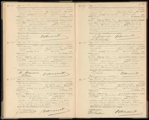 No. 121 Heden zes Januari negentienhonderd zes en twintig verschenen voor mij Ambtenaar van den burgerlijken stand van Amsterdam: Wilhelmus Jansen van beroep aanspreker oud vierenveertig jaren, wonende alhier en Jan Wacker van beroep aanspreken oud tweeenzeventig jaren, wonende alhier, die verklaarden, dat op vijf dezer des voor middags ten drie ure, in de gemeente Amsterdam is overleden Jacoba Janneke Adriana tagelkerke zonder beroep, wonende alhier oud zesenvijftig jaren, geboren te Vlissingen echtgenoote van Dominicus Bernardus Aubroeck, dochter van Adriaan Nagelkerke en Catharina Maria Klaassen beiden overleden Waarvan akte, welke avereenkomstig de wet is voorgelezen. vansoest EJamer J: Wacker No. 127 Heden zes Januari negentienhonderd zes en twintig verschenen voor mij Ambtenaar van den burgerlijken stand van Amsterdam, Michael Jagerman van beroep aanspreker oud vierenvijftig jaren, wonende alhier, en Nicolaas van der Moolen van beroep aanspreker oud drieenvijftig jaren. wonende alhier, die verklaarden, dat op vijf dezer — des voor middags ten dezen zes ure, in de gemeente Amsterdam is Francisca Hendrika Elisabeth Klaasen zonder beroep echtgenoote van Adrianus, wonende Klinkert kleermaker oud beiden wonende, geboren alhier, is be„ vallen van een kind dat zij als levenloos aangeven Goedgekeurd de doorhaling van vijf gedrukte- woorden en een geschreven woord Waarvan akte, welke overeenkomstig de wet is voorgelezen. M Jagerman vansoest. H M Moolen No. 123. Heden zes Januari negentienhonderd zes en twintig verschenen voor mij Ambtenaar van den burgerlijken stand van Amsterdam: Franciscus Franssen van beroep aanspreker oud vijfenzeventig jaren, wonende alhier. en Johannes Faber van beroep bode oud veertig jaren, wonende alhier die verklaarden, dat op