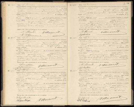 No. 193. Heden elf Januari negentienhonderd zes en twintig verschenen voor mij Ambtenaar van den burgerlijken stand van Amsterdam: Nicolaas Stronk van beroep zonder oud vierenzeventig jaren, wonende alhier en Bernardus Hermanus Veenendaal van beroep zonder oud zevenenzestig jaren — wonende alhier, die verklaarden, dat op acht dezer — des na middags ten zes ure, in de gemeente Amsterdam is overleden Margaretha Anthonia Hendrika Koppen zonder beroep, wonende alhier, oud vijfenzestig jaren, geboren alhier, dochter van Anthony Koppen en Margaretha Glebbeek, beiden overleden. Waarvan akte, welke overeenkomstig de wet is voorgelezen. N Stronk vansoert B. H Veenendaal No. 199 Heden elf Januari negentienhonderd zes en twintig verschenen voor mij Ambtenaar van den burgerlijken stand van Amsterdam: van beroep Willem Clement— aanspreker oud vijfenvijftig jaren, wonende alhier, en Anton Jacobus Belser van beroep aanspreker oud achtenveertig jaren wonende alhier die verklaarden, dat op negen dezer des voor, middags ten vier ure, in de gemeente Amsterdam is overleden Geertje te Buck zonder beroep, wonende alhier oud zeventig jaren, geboren te Warmen, huizen echtgenoote van Cornelis Duijves, van echt gescheiden echtgenoote van Ferdinandus zonneveldt dochter van Klaaste Buck en stijntje Bodijk, beiden overleden Waarvan akte, welke overeenkomstig de wet is voorgelezen. M Clement vansoest CJ Belser No. 195 Heden elf Januari negentienhonderd zes en twintig verschenen voor mij Ambtenaar van den burgerlijken stand van Amsterdam; Leendert Dispree van beroep aanspreker oud vierenzestig jaren, wonende alhier en Carel Cornelisse jaren van beroep aanspreker oud vyfenzestig wonende alhier, die verklaarden, dat op negen dezer des voor middags ten vijf ure, in de gemeente Amsterdam is overleden Maria van der Wal. zonder beroep— , wonende alhier, oud veertig jaren, geboren te Baarn, echtgenoote van Hendrik Jan Nelemans, dochter van Lourens van der Wal en Alida Gerarda Bos, beiden overleden Waarvan akte, welke overeenkomstig de wet is voorgelezen upree vansoest C Cornelisse No. 201 Heden elf Januari negentienhonderd zes en twintig verschenen voor mij Ambtenaar van den burgerlijken stand van Amsterdam, Willem Clement van beroep aanspreker oud vijfenvijftig jaren, wonende alhier en Anton Jacobus Belser van beroep aanspreker oud zesenveertig jaren wonende alhier negen dezer de veeerden der o des voor middags ten negen ure, in de gemeente Amsterdam is overleden Jannetje Verhoek— zonder beroep, wonende alhier, oud tweeenzestig jaren, geboren - alhier echtgenoote van Gerrit van Wilsem, -dochter van Hendrik Verhoek en Wilhelmima Frederika Boelhouwer, beiden overleden Waarvan afte, welke overeenkomdtig de wet is voorgeleren vansoest, W: Clement. JJ Belser. No. 197. Heden elf Januari negentienhonderd Zes en twintig verschenen voor mij Ambtenaar van den burgerlijken stand van Amsterdam: Paulus Petrus Johannes Huele van beroep aanspreker oud achtenveertig jaren, wonende alhier en Hendrik Johannes van Loevezijn van beroep aanspreker oud vierentachtig jaren, wonende alhier, die verklaarden, dat op — acht dezer des voor middags ten half vijf ure, in de gemeente Amsterdam is overleden Cornelis Roos van beroep kruidenier, wonende alhier oud negenendertig jaren, geboren alhier, zoon van Pieter Roos en Grietje Veldman beiden overleden Waarvan akte, welke overeenkomstig de wet is voorgelezen. V:P: J: Huer van soer H Jandoijn No. 203 Heden elf Januari negentienhonderd zes en twintig verschenen voor mij Ambtenaar van den burgerlijken stand van Amsterdam: Gerardus Ostendort van beroep aanspreker oud dertig jaren, wonende alhier en Willem Frederik Willem van beroep aanspreker oud zesenzeventig jaren wonende alhier, die verklaarden, dat op zeven dezer — des na middags ten negen ure, in de gemeente Amsterdam is overleden Gerardina Johanna de Jong zonder beroep, wonende alhier oud vier maanden, geboren alhier dochter van Gerben de Jong, monteur en Gerardina Johanna Sttok, zonder beroep, beiden wonende alhier Waarvan akte, welke overeenkomstig de wet is voorgelezen. vansoest J: Ostendorf WF Willems