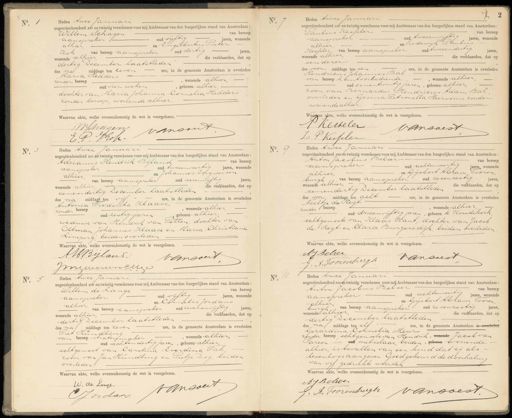 No. 1 Heden twee Januari negentienhonderd zes en twintig verschenen voor mij Ambtenaar van den burgerlijken stand van Amsterdam, van beroep Willem Schagen— aanspreker oud vijftig jaren, wonende alhier, en Engelbertus Pieter Kok van beroep aanspreker oud dertig jaren, wonende alhier die verklaarden, dat op dertig December laatstleden des na middags ten zeven ure, in de gemeente Amsterdam is overleden Maria Redders, wonende alhier zonder beroep oud vier weken, geboren alhier dochter van Maria Johanna Cornelia Hedders zonder beroep, wonende alhier. Waarvan akte, welke overeenkomstig de wet is voorgelezen. Wshegen vansout E P. Jhok. No. 7 Heden twee Januari negentienhonderd zes en twintig verschenen voor mij Ambtenaar van den burgerlijken stand van Amsterdam: Jaulus Resseler van beroep aanspreker oud tweeenvijftig jaren, wonende alhier, en Nodewyk Paulus Kesseler van beroep aanspreker oud tweeendertig jaren wonende alhier, die verklaarden, dat op een dezer des voor middags ten een, ure, in de gemeente Amsterdam is overleden Hendricus Johannes Bal van beroep kantoorbediende, wonende alhier oud eenentwintig jaren, geboren alhier zoon van Bernardus Hendricus Adam Bal overleden en Gesina Petronella Heerooms, zonder wonende alhier. Waarvan akte, welke overeenkomstig de wet is voorgelezen. Keiteler vansoest J P. Kesplen No. 3 Heden twee Januari negentienhonderd zes en twintig verschenen voor mij Ambtenaar van den burgerlijken stand van Amsterdam: Adrianus Hendrik Bijland van beroep aanspreker oud tweeenveertig jaren, wonende alhier en Johannes Ingwersen van beroep aanspreker oud vierenvijftig jaren, wonende alhier die verklaarden, dat op eenen dertig December laatstleden des na middags ten vij ure, in de gemeente Amsterdam is overleden Antonia Frederika Klaase zonder beroep, wonende alhier, oud zestig jaren, geboren alhier weduwe van Hendrik van Petten, dochter van Oltman Johannes Klaase en Maria Christiane Limperg, beiden overleden Waarvan akte, welke overeenkomstig de wet is voorgelezen. A.H Bijland vanboet Jywersen Elige No. 9 Heden twee Januari negentienhonderd zes en twintig verschenen voor mij Ambtenaar van den burgerlijken stand van Amsterdam; Anton Jacobus Belser van beroep aanspreker oud achtenveertig jaren, wonende alhier, en Gijsbert Abram Sooren„ burgh van beroep aanspreker oud zesenzestig jaren wonende alhier, die verklaarden, dat op eenen dertig December laatstleden, des voor middags ten acht ure, in de gemeente Amsterdam is overleden Neeltje de Regt— wonende alhier zonder Beroep oud drieenvijftig jaren, geboren te Koudekerk echtgenoote van Klaas Kant, dochter van Jacob, de Regt en Clara Burgersdijk, beiden overleden Waarvan akte, welke overeenkomstig de wet is voorgelezen. NJ Belser vansoest J. A. Voorenburgh No. 5 Heden twee Januari negentienhonderd zes en twintig verschenen voor mij Ambtenaar van den burgerlijken stand van Amsterdam: Willem de Lange— van beroep aanspreker oud vijftig jaren, wonende alhier, en Cornelis Jordans van beroep aanspreker oud zevenenvijftig jaren, die verklaarden, dat op wonende alhier. -dertig December laatstleden des na middags ten zeven ure, in de gemeente Amsterdam is overleden Piet Hündling van beroep stratenmaker, wonende alhier oud achtendertig jaren, geboren alhier echtgenoot van Carolina Everding Iak¬ zoon van Jan Hündling en Pietje Dog, beiden overleden Waarvan akte, welke overeenkomstig de wet is voorgelezen. W. de Lange. vansoet CJordans No. 11 Heden twee Januari negentienhonderd zes en twintig verschenen voor mij Ambtenaar van den burgerlijken stand van Amsterdam Anton Jacobus Belser van beroep aanspreker oud achtenveertig jaren, wonende alhier en Gysbert Abram Tooren burgh van beroep aanspreker oud zesenzestig jaren wonendealhier, die verklaarden, dat op dertig December laatstleden des na middags ten elf ure, in de gemeente Amsterdam is overleden Gerardina Cornelia Meur zonder beroep, echtgenoote van Hendrik, wonende Jacob van Jareen oud metselaar, beiden, geberen wonende alhier, is bevallen van een kind dat zij als levenloos aangeven. Goedgekeurd de doorhaling van vijf gedrukte woorden Waarvan akte, welke overeenkomstig de wet is voorgelezen. AJ Belec G: A. Toorenburger vansoest