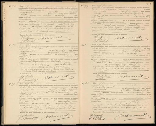 No. 73 Heden vijf Januari negentienhonderd zes en twintig verschenen voor mij Ambtenaar van den burgerlijken stand van Amsterdam; Hermanus Spaan van beroep aanspreker oud vijftig jaren, wonende alhier, en Lourens Hendrik Zabel van beroep -aanspreker oud veertig jaren wonende alhier, die verklaarden, dat op drie dezer des na middags ten tien ure, in de gemeente Amsterdam is op Aleida Voorwerk zonder beroep, echtgenoote van Jacob, wonende Boek gas litter oud beiden wonende, geboren alhier is be„ vallen van een kind dat zij als levenloos aangeven Goedgekeurd de doorhaling van vijf gedrukte woorden Waarvan akte, welke overeenkomstig de wet is voorgelezen. vansoest H. Shaan No. 79 Heden vijf Januari negentienhonderd zes en twintig verschenen voor mij Ambtenaar van den burgerlijken stand van Amsterdam: Hermanus Spaan van beroep aanspreker oud vijftig jaren, wonende alhier, en Lourens Hendrik zabel van beroep aanspreker oud veertig jaren wonende alhier, die verklaarden, dat op