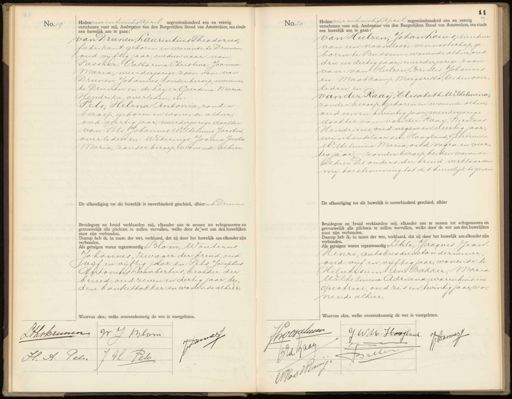 No.19. Hedenvier en twintigCaril negentienhonderd een en veertig verschenen voor mij, Ambtenaar van den Burgerlijken Stand van Amsterdam, ten einde een huwelijk aan te gaan: van Drunen, Laurentius Theodorus, fabrikant, geboren en wonende te Drunen, oud vijftig jaar, weduwnaar van: Passier, Catharina Christina Joanna Maria, meerderjarige zoon van: van Drunen, Johannes, zonder beroep, wonende te Drunen en: de Leijer, Geerdina Maria Hendrika overleden, en: Pels, Helena Antonia, zonder beroep, geboren en wonende alhier, oud veertig jaar, meerderjarige dochter van: Pels; Johannes Wilhelmus Jacobus overleden en: Weterings, Joanna Jacoba Maria, zonder beroep, wonende alhier. De afkondiging tot dit huwelijk is onverhinderd geschied, alhieren te Drienen. Bruidegom en bruid verklaarden mij, elkander aan te nemen tot echtgenooten en getrouwelijk alle plichten te zullen vervullen, welke door de wet aan den huwelijken staat zijn verbonden. Daarop heb ik, in naam der wet, verklaard, dat zij door het huwelijk aan elkander zijn verbonden. Als getuigen waren tegenwoordig: Blom, Wouterus Johannes, zwager der bruid, oud vijf en vijftig jaar en: Pels Josephus Antonius Dambertus, broeder der bruid, oud zeven en dertig jaar, beden banketbakker en wonende alhier Waarvan akte, welke overeenkomstig de wet is voorgelezen No.20 Heden vier en twintig April negentienhonderd een en veertig verschenen voor mij, Ambtenaar van den Burgerlijken Stand van Amsterdam, ten einde een huwelijk aan te gaan: van Hulzen, Johan Louis, directeur van een naamlooze vennootschap, ge boren te Bussum, wonende alhier, oud drie en dertig jaar, meerderjarige zoon van van Hulzen, Cornelis Johannes en Maatkamp, Margaretha, beiden overleden, en van der Raaij, Elisabeth Wilhelmina zonder beroep, geboren en wonende alhier, oud een en twintig jaar meerderjarige dochter van: van der Raaij, Nicolaas Hendricus oud negen en veertig jaar, wijnhandelaar en: Hoogland, Geertruida Wilhelmina Maria, oud negen en veertig jaar, zonder beroep beiden wonende alhier. De ouders der bruid verklaarden mij toestemming tot dit huwelijk te geven De afkondiging tot dit huwelijk is onverhinderd geschied, alhier Bruidegom en bruid verklaarden mij, elkander aan te nemen tot echtgenooten en getrouwelijk alle plichten te zullen vervullen, welke door de wet aan den huwelijken staat zijn verbonden. Daarop heb ik, in naam der wet, verklaard, dat zij door het huwelijk aan elkander zijn verbonden. Uls getuigen waren tegenwoordig: Ihle, Jacques JJean Henri, autobusdienstondernemer oud vijf en vijftig jaar, wonende te Hilversum Een Bakker, Maria Wilhelmina Adriana, warenhuis inspectrice, oud zes en twintig jaar, wonende alhier. Waarvan akte, welke overeenkomstig de wet is voorgelezen. Hthsbunen WJ Blam H. A. Pels J V. Febo Jhoopelm J WM. Hooslaal. J AdG Peher No 87 Goo