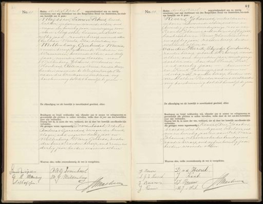 No.21. Heden dertig Chril negentienhonderd een en veertig verschenen voor mij Ambtenaar van den Burgerlijken Stand van Amsterdam, ten einde een huwelijk aan te gaan: Meijssen, Simon Petrus, broodbakker, geboren en wonende alhier, oud negen en twintig jaar, meerderjarige zoon van: Meijssen, Simon, oudacht en vijftig jaar,- zonder beroep, wonende alhier en: van Mierlo Ida, overleden, en: Miltenburg, Geerteudis Maria, zonder beroep, geboren te Vinkeveen en Waverveen, wonende alhier, oud dertig jaar, meerderjarige dochter van: Miltenburg, Johannes, verhouder en Honkoop, Adriana Anna, zonder beroep beiden wonende te Weesperkarspel. Dit vader des bruidegoms verklaarde mij toestemming tot dit huwelijk te geven.De afkondiging tot dit huwelijk is onverhinderd geschied, alhier Bruidegom en bruid verklaarden mij, elkander aan te nemen tot echtgenooten en getrouwelijk alle plichten te zullen vervullen, welke door de wet aan den huwelijken staat zijn verbonden. Daarop heb ik, in naam der wet, verklaard, dat zij door het huwelijk aan elkander zijn verbonden. Als getuigen waren tegenwoordig: Doorenbosch, Albertus Andreas Gierardus zwager der bruid, slager, oud negen en dertig jaar en: Wiltenburg Maria Gerarda, zuster der bruid, zonder beroep, oud zeven en dertig jaar, beiden wonende alhier. Waarvan akte, welke overeenkomstig de wet is voorgelezen. No. 22. Heden dertig Cpril negentienhonderd een en veertig verschenen voor mij, Ambtenaar van den Burgerlijken Stand van Amsterdam, ten einde een huwelijk aan te gaan: Revers, Johannes, metaaldraaier, geboren en wonende alhier, oud een en twintig jaar, meerderjarige zoon van Revers Johannes oud vier en vijftig jaar, bankwerker en: Pauw, Johanna, oud zes en vijftig jaar, zonder beroep, beiden wonende alhier, en van den Heer ik Stijntje Geertruida, zonder beroep, geboren te Boskoop, wonende alhier, oud negentien jaar, minderjarige dochter van van den Heerik, Dirk, oud veertig jaar, — tuinman en: /Kant, Jannigse, oud zeven en dertig jaar, zonder beroep, beiden wonende alhier. Beider ouders verklaarden mij toestemming tot dit huwelijk te geven De afkondiging tot dit huwelijk is onverhinderd geschied, alhier Bruidegom en bruid verklaarden mij, elkander aan te nemen tot echtgenooten en getrouwelijk alle plichten te zullen vervullen, welke door de wet aan den huwelijken staat zijn verbonden. Daarop heb ik, in naam der wet, verklaard, dat zij door het huwelijk aan elkander zijn verbonden. Als getuigen waren tegenwoordig Revers, Drie Jacobus broeder des bruidegoms, schilder, oud vier en twintig jaar en van Ark, Maria Johanna, schoonzuster des bruidegoms zonder beroep, oud vijf en twintig jaar beiden wonende alhier. Waarvan akte, welke overeenkomstig de wet is voorgelezen. AaG Sonenbosch tmon mersen G. M. Millenburg M G Miltenburg S. Meijssen. WMaaluwe D vd Heerik J Revers Kunt D G. v/d Heerik AMaakeee A.J: Reven Reven M.J. v. Ark. Pouwe
