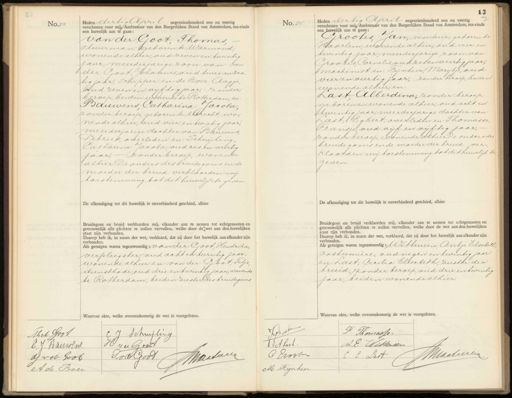 No33. Heden dertig April negentienhonderd een en veertig verschenen voor mij Ambtenaar van den Burgerlijken Stand van Amsterdam, ten einde een huwelijk aan te gaan: van der Goot, Thomas Ttuurman, geboren te Warmond, wonende alhier, oud zeven en twintig jaar meerderjarige zoon van: van der Goot, Johannes, oud twee en zes„ tig jaar, schipper en de Boer Aagje, oud zeven en vijftig jaar, zzonder beroep, beiden wonende te Rotterdam, en Bauwens, Catharina Jacoba zonder beroep, geboren te Vtrecht, wo„ nende alhier, oud vier en twintig jaar meerderjarige dochter van Bauwens, Petrus, overleden en Schuijling; Catharina Jacoba, oud zes en veertig jaar, — zonder beroep, wonende alhier De ouders des bruidegoms en de moeder der bruid verklaarden mij toestemming tot dit huwelijk te geven De afkondiging tot dit huwelijk is onverhinderd geschied, alhier Bruidegom en bruid verklaarden mij, elkander aan te nemen tot echtgenooten en getrouwelijk alle plichten te zullen vervullen, welke door dewet aan den huwelijken staat zijn verbonden. Daarop heb ik, in naam der wet, verklaard, dat zij door het huwelijk aan elkander zijn verbonden. Als getuigen waren tegenwoordig: van der Goot, Hendrika, verpleegster oud acht en twintig jaar. wonende alhier en: van der Goot, Petje, dienstbode, oud drie en twintig jaar, wonende te Rotterdam, beiden zuster des bruidegoms, Waarvan akte, welke over g de wet is voorgelezen. No. 27. Heden dertig April negentienhonderd een en veertig verschenen voor mij Ambtenaar van den Burgerlijken Stand van Amsterdam, ten einde een huwelijk aan te gaan: Hrootes, Jan, monteur, geboren te Haarlem, wonende alhier, oud vier en twintig jaar, meerderjarige zoon van Grootes, Cornelis, oud zes en veertig jaar, machinist en Fijnheer, Marijtje, oud vier en veertig jaar, zonder beroep, beiden wonende alhier, en Last, Alberdina, zonder beroep, geboren en wonende alhier, oud acht en twintig jaar, meerderjarige dochter van Last, Egbert, overleden en Thomasse Fransje, oud vijf en vijftig jaar, zonder beroep, wonende alhier. De ouders de bruidegoms en de moeder der bruid ver„ klaarden mij toestemming tot dit huwelijk te geven. De afkondiging tot dit huwelijk is onverhinderd geschied, alhier Bruidegom en bruid verklaarden mij, elkander aan te nemen tot echtgenooten en getrouwelijk alle vlichten te zullen vervullen, welke door de wet aan den huwelijken staat zijn verbonden. Daarop heb ik, in naam der wet, verklaard, dat zij door het huwelijk aan elkander zijn verbonden. Als getuigen waren tegenwoordig: Wittereen Antie Elisabeth Costumiere, oud negen en twintig jaar en Last, Cecilia Elisabeth, zuster der bruid, zonder beroep, oud drie en twintig jaar, beiden wonende alhier. Waarvan akte, welke over istig de wet is voorgelezen. Ahod Goot C. J Schuijling H v. v. Goot L. J. Bauwens AMaatarig P vd Goot AJ vd Goot A de Boer Groste F Tomasse. V OAt last A.E. Uittereer NMMaateeren C Grvst C E Luit M Kijnheer