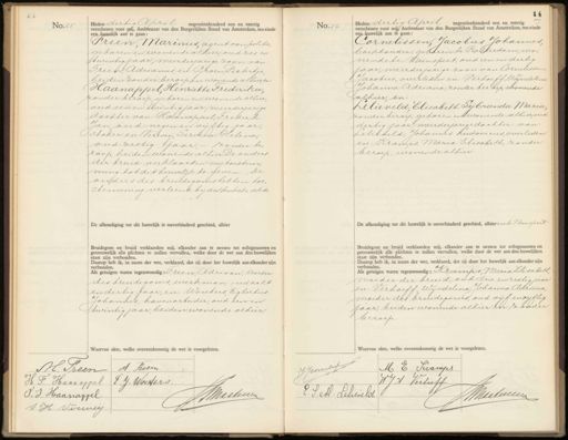 No.25. Heden dertig Ahril negentienhonderd een en veertig verschenen voor mij, Ambtenaar van den Burgerlijken Stand van Amsterdam, ten einde een huwelijk aan te gaan: Freen, Warinus, agent van politie, geboren en wonende alhier, oud zes en twintig jaar, meerderjarige zoon van: Freen, Adrianus, en: Groen Pietertje, beiden zonder beroep en wonende alhier, en Haanappel, Henriette Frederika zonder beroep, geboren en wonende alhier oud een en twintig jaar, meerderjarige dochter van Haanappel, Frederik Jan oud negen en vijftig jaar, stoker en Verweij Pervina Helena, oud zestig jaar,- zonder be¬ roep, beiden wonende alhier, De ouders der bruid verklaarden mij toestem„ ming tot dit huwelijk te geven. De ouders des bruidegoms hebben toe„ stemming verleend bij authentieke akte. De afkondiging tot dit huwelijk is onverhinderd geschied, alhier Bruidegom en bruid verklaarden mij, elkander aan te nemen tot echtgenooten en getrouwelijk alle plichten te zullen vervullen, welke door de wet aan den huwelijken staat zijn verbonden. Daarop heb ik, in naam der wet, verklaard, dat zij door het huwelijk aan elkander zijn verbonden. Als getuigen waren tegenwoordig: Preen, Adriaan, bloeder des bruidegoms, werkman, oud acht en dertig jaar, en: Wouters Egbertus Johannes, havenarbeider, oud een en twintig jaar, beiden wonende alhier. Waarvan akte, welke overeenkomstig de wet is voorgelezen. No. 26. Heden dertig April negentienhonderd een en veertig verschenen voor mij Ambtenaar van den Burgerlijken Stand van Amsterdam, ten einde een huwelijk aan te gaan: Cornelissen, Jacobus Johannes, boekhouder, geboren te Rotterdam, wo„ nende te Runspect, oud een en dertig jaar, meerderjarige zoon van Cornelissen, Jacobus, overleden en: Verhoeft, Wijndelina Johanna Adriana, zonder beroep, wonende alhier, en: Lelieveld Elisabeth Fijbranda Maria, zonder beroep, geboren en wonende alhier, oud dertig jaar, meerderjarige dochter van: Lelieveld, Johannes Rudovicus overleden en: Kramps, Maria Elisabeth, zonder beroep, wonende alhier. De afkondiging tot dit huwelijk is onverhinderd geschied, alhier en te Vanspect. Bruidegom en bruid verklaarden mij, elkander aan te nemen tot echtgenooten en getrouwelijk alle plichten te zullen vervullen, welke door de wet aan den huwelijken staat zijn verbonden. Daarop heb ik, in naam der wet, verklaard, dat zij door het huwelijk aan elkander zijn verbonden. Als getuigen waren tegenwoordig: Kramps, Maria Elisabeth, moeder der bruid oud drie en zestig jaar en Verhoeft, Wijndelina Johanna Adriana, moeder des bruidegoms, oud vijf en vijftig jaar, beiden wonende alhier en zonder beroep. Waarvan akte, welke overeenkomstig de wet is voorgelezen. H. Preen A. Reem H F. Haanappel J J. Worders. NMaake J.J. Haanappel