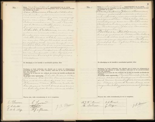 No. 1 Heden zestien April negentienhonderd een en veertig verschenen voor mij, Ambtenaar van den Burgerlijken Stand van Amsterdam, ten einde een huwelijk aan te gaan: van Klaveren, Cornelis Albertus, bankwerker, geboren en wonende alhier oud vier en twintig jaar, meerderjarige zoon van van Klaveren, Johannes Petrus, overleden en Jansen, Cornelia oud zeven enzestig jaar, zonder beroep, wonende alhier, en Schutte, Catharina, zonder beroep, geboren en wonende alhier, oud een en twintig jaar, meerderjarige dochter van Schutte, Fredrik Willem, veemarbeider en: van der Pluijs, Elisabeth, oud een en vijftig jaar, zonder beroep, beiden wonende alhier. De beide moeders verklaarden mij toestemming tot dit huwelijk te geven. Uit een proces verbaal van tusschenkomst van den kantonrechter alhier blijkt, dat de vader der bruid op de oproeping niet is verschenen. De afkondiging tot dit huwelijk is onverhinderd geschied, alhier Bruidegom en bruid verklaarden mij, elkander aan te nemen tot echtgenooten en getrouwelijk alle plichten te zullen vervullen, welke door de wet aan den huwelijken staat zijn verbonden. Daarop heb ik, in naam der wet, verklaard, dat zij door het huwelijk aan elkander zijn verbonden. als getuigen waren tegenwoordig: Schutte, Frederik Willem Johannes, broeder der bruid, marechaus. ssee, oud zes en twintig jaar en van Klaveren, Maria Johanna, zuster des bruidegoms, zonder beroep, oud zeven en twintig jaar, beiden wonende alhier. Waarvan akte, welke overeenkomstig de wet is voorgelezen. No. 2. 2 Heden zestien Chril negentienhonderd een en veertig m verschenen voor mij, Ambtenaar van den Burgerlijken Stand van Amsterdam, ten einde een huwelijk aan te gaan: Bune, Antonius Johannes Franciscus slager, geboren en wonende alhier, oud zes en veertig jaar, van echtgescheiden echtgenoot van: Blok, Neeltje Johanna meerderjarige zoon van: Bune, Leonardus Antonius, Schoenmaker, wonende alhier en: Berkemeijer Johanna Bernardina overleden, en: Bolhaar, Katharina zonder beroep, geboren te Rodde in Duitschland wonende alhier, oud acht en veertig jaar, meerderjarige dochter van: Bolhaar, Gerhard en: Egbers, Maria, beiden overleden. De afkondiging tot dit huwelijk is onverhinderd geschied, alhier Bruidegom en bruid verklaarden mij, elkander aan te nemen tot echtgenooten en getrouwelijk alle plichten te zullen vervullen, welke door de wet aan den huwelijken staat zijn verbonden. Daarop heb ik, in naam der wet, verklaard, dat zij door het huwelijk aan elkander zijn verbonden. Als getuigen waren tegenwoordig: Bine, Leonardus Anto„ nius, vader des bruidegoms, schoenmaker oud zes en zeventig jaar, wonende alhier en: Meijer, Gerrit, zonder beroep, oud negen en zestig jaar, wonende te zaandam Waarvan akte, welke overeenkomstig de wet is voorgelezen. C. v Klaveren E Jansen J R Mtuw ak C Schutte. E: V.d: Heijs Ab. J. v. Hlaveren L A Buwe A JT Bune J d dor K Bolhvear G Mezn