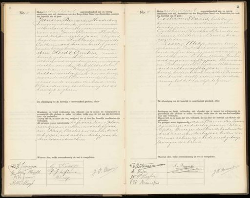 No. 3. Heden zestien April negentienhonderd een en veertig verschenen voor mij, Ambtenaar van den Burgerlijken Stand van Amsterdam, ten einde een huwelijk aan te gaan: Jansen, Bernardus Hendrikus Smagazijnbediende, geboren en wonende alhier oud twintig jaar minderjarige zoon van Jansen Bernardusendrikus oud zes en veertig jaar, sleepboot. kapitein en: Slegt, Naatje Margaretha Catharina, oud vier en veertig jaar zonder beroep, beiden wonende alhier, en den Hoedt, Geertrui, zonder beroep, geboren te Heemstede, wonende alhier, oud negentien jaar, minderjarige dochter van: den Hoedt, Abraham, overleden en: Krap, Geertrui, oud acht en veertig jaar, zonder beroep wonende alhier. De ouders des bruide goms en de moeder der bruid ver„ klaarden mij toestemming tot dit huwelijk te geven. De afkondiging tot dit huwelijk is onverhinderd geschied, alhier Bruidegom en bruid verklaarden mij, elkander aan te nemen tot echtgenooten en getrouwelijk alle plichten te zullen vervullen, welke door de wet aan den huwelijken staat zijn verbonden. Daarop heb ik, in naam der wet, verklaard, dat zij door het huwelijk aan elkander zijn verbonden. Als getuigen waren tegenwoordig: Lefevere Frans Johan, werkman, oud een en veertig jaar, en: Krap Bastiaan, oom der bruid schipper, oud acht en dertig jaar, bes den wonende alhier. Waarvan akte, welke overeenkomstig de wet is voorgelezen. No. 4. 3 Heden zestien Chril negentienhonderd een en veertig m verschenen voor mij, Ambtenaar van den Burgerlijken Stand van Amsterdam, ten einde een huwelijk aan te gaan: Oosterveen, David, besteller, ge„ boren en wonende alhier, oud zeven en twintig jaar, meerderjarige zoon van Oosterveen, Christiaan Cornelis, en Tweers, Wilhelmina Cornelia, beiden overleden, en Visser, Wlekje, zonder beroep, geboren te Buiksloot, wonende alhier, oud vijf en twintig jaar, meerderjarige dochter van Visser, Wouter Jacobus, oud negen en vijftig jaar, timmerman en: Bruinssins, Engelina Wilhelmina, oud acht en vyftig jaar, zonder beroep beiden wonende alhier. De ouders der bruid verklaarden mij toestem„ ming tot dit huwelijk te geven. De afkondiging tot dit huwelijk is onverhinderd geschied, alhier Bruidegom en bruid verklaarden mij, elkander aan te nemen tot echtgenooten er getrouwelijk alle plichten te zullen vervullen, welke door de wet aan den huwelijken staat zijn verbonden. Daarop heb ik, in naam der wet, verklaard, dat zij door het huwelijk aan elkander zijn verbonden. Als getuigen waren tegenwoordig: van Brummelen, Leymon concierge, oud dertig jaar en Autes Opke, zwaaer der Aruid, bankwerker, oud zevenen dertigjaar, beiden wo„ nende alhier, zijnde de eerste getuige Jzwager der bruid eenkon Krup G B. H. Janser J R. de J J. hefzing G den Hoedt BH Jane AKrop N M C. Slegt Dllateneen H a Bruman J Me aatn M Visser W P Visser E H Bruinssins