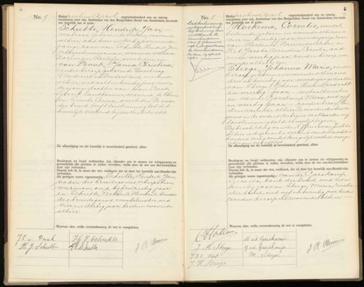 No. 7. Heden zestien Ahril negentienhonderd een en veertig verschenen voor mij, Ambtenaar van den Burgerlijken Stand van Amsterdam, ten einde een huwelijk aan te gaan: Schutte, Hendrik Jan, matroos geboren te Leiden, wonende alhier, oud twee en dertig jaar, meerderjarige zoon van Schutte, Hendrik Jan, Scheepstimmerman, wonende alhier en Dozeman, Roelofje overleden, en: van Baak,Janna Christina, zonder beroep, geboren te Duisburg Meiderich in Duitschland, wonende alhier, oud acht en twintig jaar, meerderjarige dochter van van Baak, Gerrit, landbouwer, wonende te Rhenen en. Smits, Anna, overleden. De vader der bruid heeft toestemming tot dit huwelijk verleend bij authentiee akte. De afkondiging tot dit huwelijk is onverhinderd geschied, alhier Bruidegom en bruid verklaarden mij, elkander aan te nemen tot echtgenooten en getrouwelijk alle plichten te zullen vervullen, welke door de wet aan den huwelijken staat zijn verbonden. Daarop heb ik, in naam der wet, verklaard, dat zij door het huwelijk aan elkander zijn verbonden. Ads getuigen waren tegenwoordig: Schutte, Hendrik Jan vader des bruidegoms, scheepstimmerman, oud vijf en zestig jaar en: Schutte, Frederik Hendrik, broeder des bruidegoms, meubelmaker, oud vier en dertig jaar, beiden wonende alhier. Waarvan akte, welke overeenkomstig de wet is voorgeleze No. 8. No. 8. Echtscheiding. uitgesproken bij kanming der richtbank te Amsterdam van 7 februari 1963, Ingusclriven te Amnsterdam, heden, 19 april 1963. — D5 n Heden zestien April negentienhonderd een en veertig verschenen voor mij, Ambtenaar van den Burgerlijken Stand van Amsterdam, ten einde een huwelijk aan te gaan: Hoekema, Cornelis, winkelbediende, geboren en wonende alhier, oud vier en twintig jaar, meerderjarige zoon van Hoekema, Bruin, overleden en Ket Jacoba Berendina Cornelia, oud zes en veertig jaar, zonder beroep, wonende alhier en. Steege, Johanna Maria, zonder beroep, geboren en wonende alhier, oud drie en twintig jaar, meerderjarige dochter van: Steege, Johann Hinrich, oud acht en veertig jaar, - metaalbewerker en van de Garskamp, Maria oud vijf en veertig jaar, zonder beroep, bei den wonende alhier. De moeder des bruide goms en de ouders derbruid verklaarden mi toestemming tot dit huwelijk te geven Bijbeschikking van den Officier van Justitie alhier is dispensatie verleend van den in artikel honderd dertig van het Burgerlijk wetboek voorge schreven wachttijd. De afkondiging tot dit huwelijk is onverhinderd geschied, alhier Bruidegom en bruid verklaarden mij, elkander aan te nemen tot echtgenooten en getrouwelijk alle plichten te zullen vervullen, welke door de wet aan den huwelijken staat zijn verbonden. Daarop heb ik, in naam der wet, verklaard, dat zij door het huwelijk aan elkander zijn verbonden. Als getuigen waren tegenwoordig: van de Garskamp, Gerarda, tante der bruid, oud zes en veertig vaar en: Steege Maria, zuster der bruid, oud vijf en twintig jaar, beiden zonder beroep en wonende alhier. Waarvan akte, welke overeenkomstig de wet is voorgelezen. J.C v. Baak H I Sohukt JR. Mo H: J: Schutte H Deav Loeke 6 M vd. Garskamp. JR M G. vd Garskemp J. M Steege M Steege. J.BC Kel J.H. Steege