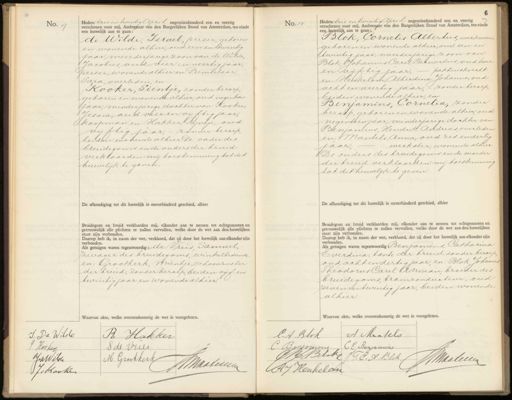 No. 9 Heden drie en twintig April negentienhonderd een en veertig verschenen voor mij, Ambtenaar van den Burgerlijken Stand van Amsterdam, ten einde een huwelijk aan te gaan: de Wilde, Isroel, perser, geboren en wonende alhier, oud een en twintig jaar, meerderjarige zoon van: de WildeJacobus oud vier en veertig jaar, perser, wonende alhier en Premselaar, Pard, overleden, en Kooker, Tientje, zonder beroep, geboren en wonende alhier, oud negentien jaar, minderjarige dochter van: Kooker, Jesdia, oud vier en vijftig jaar, koopman en Hakker Rijntje, oud vijftig jaar,- zonder beroep beiden wonende alhier. De vader des bruidegoms en de ouders der bruid verklaarden mij toestemming tot dit huwelijk te geven. De afkondiging tot dit huwelijk is onverhinderd geschied, alhier Bruidegom en bruid verklaarden mij, elkander aan te nemen tot echtgenooten en getrouwelijk alle plichten te zullen vervullen, welke door de wet aan den huwelijken staat zijn verbonden. Daarop heb ik, in naam der wet, verklaard, dat zij door het huwelijk aan elkander zijn verbonden. Als getuigen waren tegenwoordig: de Vries Samuel zwager des bruidegoms, winkelbediende en: Grootkerk, mientje, schoonzuster der bruid, zonder beroep, beiden vijf en twintig jaar en wonende alhier. Waarvan akte, welke overeen de wet is voorgelezen. No. 10 6 Hedendrie en twintigpril negentienhonderd een en veertig m verschenen voor mij, Ambtenaar van den Burgerlijken Stand van Amsterdam, ten einde een huwelijk aan te gaan; Blok, Cornelis Albertus, werkman geboren en wonende alhier, oud een en twintig jaar, meerderjarige zoon van Blok, Johannes Carel Bernardus, oud twee en vijftig jaar, — pakhuiskrecht en Heukelom, Alberdina Johanna, oud acht en veertig jaar, - zonder beroep, beiden wonende alhier, en Benjamins, Cornelia, zonder beroep, geboren en wonende alhier, oud negentien jaar, minderjarige dochter van Benjamins, Hendrik Andreds, overleden en: Mantels, Anna, oud zes en dertig jaar, werkster, wonende alhier De ouders des bruidegoms en de moeder der bruid verklaarden mij toestemming tot dit huwelijk te geven. De afkondiging tot dit huwelijk is onverhinderd geschied, alhier Bruidegom en bruid verklaarden mij, elkander aan te nemen tot echtgenooten en getrouwelijk alle plichten te zullen vervullen, welke door de wet aan den huwelijken staat zijn verbonden. Daarop heb ik, in naam der wet, verklaard, dat zij door het huwelijk aan elkander zijn verbonden. Als getuigen waren tegenwoordig Benjamins, Catharina verdina, tante der bruid, zonder beroep oud acht en dertig jaar en: Blok Johannes Theodorus Carel Adriaan, broeder der bluidegoms, tramconducteur, oud zeven en twintig jaar, beiden wonende alhier. Waarvan akte, welke overeenkomstig de wet is voorgelezen. I. De Wilde Re Hakker J. de Vries J Kosser M. Grootkerk JJhWilser JMratenwe Ze Rooken A Mantels C. H. Blok Bensomms CE Benjamins CB Bls J. E.A Blik JMaalecien AJ Heukelan