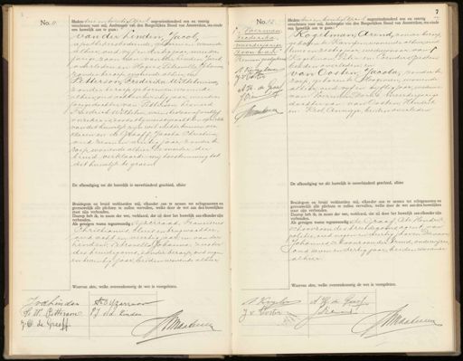 No. 11. Heden drie en twintig Ahril negentienhonderd een en veertig verschenen voor mij, Ambtenaar van den Burgerlijken Stand van Amsterdam, ten einde een huwelijk aan te gaan: van der Linden, Jacob, apothekersbediende, geboren en wonende alhier, oud vijf en dertig jaar, meerderjarige zoon van van der Linden, Jacob, overleden en Hogers, Petronella Johanna, zonder beroep, wonende alhier, en Petterson, Frederika Wilhelmina, zonder beroep, geboren en, wonende alhier, oud acht en twintig jaar, meerders tarige dochter van: Petterson, Leonard Friedrich Wilhelm, wiensbestaan of verblyf onzeker is, zoodat hij wordt geacht ten opzichte van dit huwelijk zijn wil niet te kunnen verklaren en de Graaff, Jacoba Christina oud zeven en veertig jaar, zonder be roep, wonende alhier. De moeder der bruid verklaarde mij toestemming tot dit huwelijk te geven. De afkondiging tot dit huwelijk is onverhinderd geschied, alhier Bruidegom en bruid verklaarden mij, elkander aan te nemen tot echtgenooten en getrouwelijk alle plichten te zullen vervullen, welke door de wet aan den huwelijken staat zijn verbonden. Daarop heb ik, in naam der wet, verklaard, dat zij door het huwelijk aan elkander zijn verbonden. Als getuigen waren tegenwoordig. Izerraad, Franciscus Christianus, Sluis en brugwachter, oud acht en veertig jaar, en: van der Linden, Petronella Johanna, zuster des bruidegoms, zonder beroep, oud negen en twintig jaar, beiden wonende alhier. Waarvan akte, welke overeenkomstig de wet is voorgelezen. No.12. ¶ „ Voerman, Frederika, meerderjarige zoon van Renvooi goedgekeurd NVogelmer J. V Oosten A H. de Graaf JVen Seterd Heden drie en twintig April negentienhonderd een en veertig verschenen voor mij, Ambtenaar van den Burgerlijken Stand van Amsterdam, ten einde een huwelijk aan te gaan: Rogelman, Arend, zonder beroep geboren te Kampen, wonende alhier, ond twee en zestig jaar, weduwnaar van:/ Rogelman, Peter en: Coenders, Geesken, beiden overleden, en van Oosten Jacoba, zonder beroep, geboren te Hoogeveen, wonende alhier, oud vijf en vijftig jaar, weduwe van: Voerman, Doris, meerderjarige dochter van: van Oosten, Hendrik en: Krol, Annigje, beiden overleden. De afkondiging tot dit huwelijk is onverhinderd geschied, alhier Bruidegom en bruid verklaarden mij, elkander aan te nemen tot echtgenooten en getrouwelijk alle plichten te zullen vervullen, welke door de wet aan den huwelijken staat zijn verbonden. Daarop heb ik, in naam der wet, verklaard, dat zij door het huwelijk aan elkander zijn verbonden. Als getuigen waren tegenwoordig: de Graaf Ate Hendrik Schoorzoon des bruldegoms, agent van politie, oud negen en veertig jaar en Dienaar Johannes, Schoonzoon der truid, onderwijzer, loud zeven en dertig jaar, beiden wonende alhier. Waarvan akte, welke overeenkomstig de wet is voorgelezen. Jvdhinden FEyzeraar H: H: Petterson JJ: vd. Zinden J: C de Graaff PMaalier J Koyelim A H. de Graaf V23 J Renard J v Oosten MMaaticue