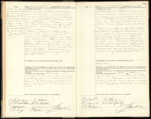 No. 17 Achtscheiding uitgesprokeer bij vonnis der Lechtbank te Amstutaire van 13 Janua r0 1949 inge- schieven te. Anderdam bedan 29 Juli '949 RR Mummel No. 17 Heden drie en twintig Apul negentienhonderd een en veertig verschenen voor mij, Ambtenaar van den Burgerlijken Stand van Amsterdam, ten einde een huwelijk aan te gaan: Uitendaal, Johannes, schipper geboren te venhorn wonende alhier oud drie en twintig jaar, meerderjarige doon van: Uijtendaal, Johannes, oud vier en vijftig jaar schipper en ter Stege, Jantina, oud vijf en vijf- tig jaar, zonder beroep, beiden wonende alhier, en Allers, Johanna Hendrika zonder beroep, geboren en wonende alhier, oud achttien jaar, minderja„ rige dochter van: Allers, Jan, oud zes en veertig jaar, koopman, en- Mulder, Maria Hendrika, oud vier en veertig jaar, zonder beroep, beiden wonende alhier. Beider ouders ver„ klaarden mij toetemming tot des huwelijk te geven. De afkondiging tot dit huwelijk is onverhinderd geschied, alhier Bruidegom en bruid verklaarden mij, elkander aan te nemen tot echtgenooten en getrouwelijk alle plichten te zullen vervullen, welke door de wet aan den huwelijken staat zijn verbonden. Daarop heb ik, in naam der wet, verklaard, dat zij door het huwelijk aan elkander zijn verbonden. Als getuigen waren tegenwoordig: Oranje Jan zwager der bruid vulcaniseerder oud dertig jaar, en. uitendaal Petrus broeder des bruidegoms, schipper oud drie en dertig jaar, beiden wonende alhier Waarvan akte, welke overeenkomstig de wet is voorgelezen. No. 18 Heden drie en twintig April negentienhonderd een en veertig verschenen voor mij, Ambtenaar van den Burgerlijken Stand van Amsterdam, ten einde een huwelijk aan te gaan: Halberstadt, Henri, magazijnbe diende, geboren en wonende alhier oud dertig jaar meerderjarige zoon van: Halberstadt, salomon, over leden, en Kruyt, Johanna Into netta, zonder beroep, wonende alhier en Spruit, Hendrika Elisabeth dienstbode, geboren te Rotterdam, 100. nende alhier, oud een en twintig jaar. meerderjarige dochter van: spruit, Godefridus Adrianus Johannes overleden. en. Verboom, Hendrika Geertruida, oud zeven en vijftig jaar zonder beroep wonende te Rotterdam, De moeder der bruid verklaarde mij toestemming tot dit huwelijk te geven: De afkondiging tot dit huwelijk is onverhinderd geschied, alhier en te Rotterdam Bruidegom en bruid verklaarden mij, elkander aan te nemen tot echtgenooten en getrouwelijk alle plichten te zullen vervullen, welke door de wet aan den huwelijken staat zijn verbonden. Daarop heb ik, in naam der wet, verklaard, dat zij door het huwelijk aan elkander zijn verbonden. Als getuigen waren tegenwoordig: Cohen, teblia zonder beroep, oud achten twintig Jaar, en. Groger, Karl Borromaeus Richard Paul, zonder beroep, oud drie en twintig jaar, beiden wonende alhier Waarvan akte, welke overeenkomstig de wet is voorgelezen. J Wlybendaal 7. Allero. JH Allers-MM.H. Mulder Juyterdeu J. Jran Maateeur Jter Aleger v. Vijkedaal Vanhmr R loken K.B:B. Vrogen H.E spriff NMaaticen H.J Borboon