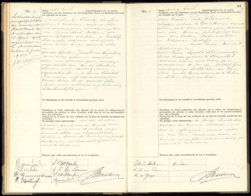 No. 29 No. 29 leAtscheiding uitgesproben bij vounis der Keertbank te Anmtidam van 15 April 1948, ingeschieven te Amsterdam heden 2 Juni 1978 JR Uen Heden dertig April negentienhonderd een en veertig verschenen voor mij, Ambtenaar van den Burgerlijken Stand van Amsterdam, ten einde een huwelijk aan te gaan: Gomersbach, Charly chauffeur geboren te Rotterdam, wonende alhier oud twintig jaar, minderjarige zoon van: Lomersbach, Willem, oud negenenvijftig faar winkelier, en: Westhof, Petronella, oud een en veertig jaar zonder beroep beiden wonende alhier en van der Meulen, Josephina Magdalena zonder beroep, geboren en wonende alhier, oud zeventien jaar, minder ja rige dochter van: van der Meulen, Simon, oud veertig jaar. expeditieknecht, en: de Leeuw, Elisabeeh Francisia, oud negenendertig jaar zonder beroep, beiden wonende alhier Beider ouders verklaarden mij toestemming tot dit huwelijk te geven. De afkondiging tot dit huwelijk is onverhinderd geschied, alhier Bruidegom en bruid verklaarden mij, elkander aan te nemen tot echtgenooten en getrouwelijk alle plichten te zullen vervullen, welke door de wet aan den huwelijken staat zijn verbonden. Daarop heb ik, in naam der wet, verklaard, dat zij door het huwelijk aan elkander zijn verbonden. Als getuigen waren tegenwoordig: van der Meulen Simon, grootvader der bruid zonder beroep, oud een en zzeventig jaar wonende alhier, en: Gomersbach Anthoni, broeder des bruidegoms, gemeente Ambtenaar, oud zesendertig jaar, i0o- nende te Rotterdam. Waarvan akte, welke overeenkomstig de wet is voorgelezen No. 30 Heden dertig April negentienhonderd een en veertig verschenen voor mij, Ambtenaar van den Burgerlijken Stand van Amsterdam, ten einde, een huwelijk aan te gaan: van Oosten, Pieter Berend, schipper, geboren te Izendoon wonende alhier oud zes en veertig jaar, weduwwaar van: Tor, Maria, meerderjarige zoon van: van Oosten Pieter, overleden en: Veldman, Roelofje, zonder beroep, wonende te Rotterdam, en van Veen, Igatha Meinouwtje zonder beroep, geboren te Medemblik wonende alhier, oud dertig jaar weduwe van: de Jonge,, Aaldert Jan meerderjarige dochter van: van Teen, Dirk zonder beroep, wonende te Heiloo en Eken,, ontje, overleden De afkondiging tot dit huwelijk is onverhinderd geschied, alhier Bruidegom en bruid verklaarden mij, elkander aan te nemen tot echtgenooten en getrouwelijk alle plichten te zullen vervullen, welke door de wet aan den huwelijken staat zijn verbonden. Daarop heb ik, in naam der wet, verklaard, dat zij door het huwelijk aan elkander zijn verbonden. Als getuigen waren tegenwoordig: de Jonge, lambertus zwagen der bruid, schipper, oud drie en vijftig jaar, wonende alhier en van Veen Martinus, broeder der bruid, water fitter, oud vier en dertig jaar wonende te Zaandam Waarvan akte, welke overeenkomstig de wet is voorgelezen. J. VJolmeulen Jarnn E F de Leeuwe JM vd Meulen Gomersbach S: V.d. Meulen, NMaaliew H Somersbart P Westhof PB. Dee Arst M v. Veen AM van Veen NMMaakeen B. de Jouge