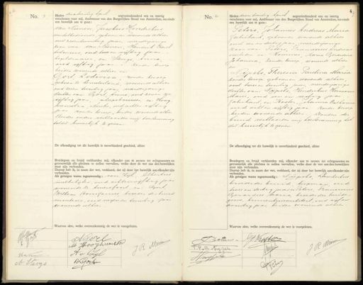 No. 5 Heden drie en twintig April negentienhonderd een en veertig verschenen voor mij, Ambtenaar van den Burgerlijken Stand van Amsterdam, ten einde een huwelijk aan te gaan: van Nunen, Jacobus Hendrikus winkelbediende, geboren en wonende alhier oud zesentwintig jaar, meerderjarige zoon van: van Nunen, Hendrik Karel Intonius, oud twee en vijftig jaar kogeldraauer, en: Stengs, Anna oud vijftig jaar.- zonder beroep beiden wonende alhier en. Gort Lodivica zonder beroep geboren te kemsterland, wonende alhier oud zesen twintig jaar meerderjarige dochter van: Gort, Inne, oud zeven en vijftig jaar, scheepsbouwer, en: Hoog Liemstra, Minke, oud achten vijftig jaar zonder beroep, beiden wonende alhier Beider ouders verklarrden mij toestemming tot dit huwelijk te geven. De afkondiging tot dit huwelijk is onverhinderd geschied, alhier Bruidegom en bruid verklaarden mij, elkander aan te nemen tot echtgenooten en getrouwelijk alle plichten te zullen vervullen, welke door de wet aan den huwelijken staat zijn verbonden. Daarop heb ik, in naam der wet, verklaard, dat zij door het huwelijk aan elkander zijn verbonden. Ads getuigen waren tegenwoordig: van Zijl, Albertus melkslijker, oud achtenvijftig jaar, wonende te Amersfoort, en: Gort, Willem Bonifauus, broeder der bruid monteur, oud negen en twintig jaar wonende alhier Waarvan akte, welke overeenkomstig de wet is voorgelezen. No. 6 Heden drieen twintig April negentienhonderd een en veertig verschenen voor mij, Ambtenaar van den Burgerlijken Stand van Amsterdam, ten einde een huwelijk aan te gaan: Peters, Johannes Andreas Maria fabrikant, geboren en wonende alhier. oud een en dertig jaar, meerderjarige zoon van: Peters, Franciscus Andreas overleden en: Rommes Maria Gerardina Johanna, zonder beroep, wonende alhier en Nijpels, Theresia Paulina Maria zonder beroep, geboren en wonende alhier, oud twee en twintig jaar, meerderjarige dochter van: Nijpels, Hendrikus Hermanus Marie, oud een en zestig jaar fabrikant en: Koster, Johanna Catharina oud acht en vijftig jaar zonder beroep beiden wonende alhier. Douders der bruid verklaarden mij toestemming tot dit huwelijk te geven. De afkondiging tot dit huwelijk is onverhinderd geschied, alhier Bruidegom en bruid verklaarden mij, elkander aan te nemen tot echtgenooten en getrouwelijk alle plichten te zullen vervullen, welke door de wet aan den huwelijken staat zijn verbonden. Daarop heb ik, in naam der wet, verklaard, dat zij door het huwelijk aan elkander zijn verbonden. Als getuigen waren tegenwoordig: Nypels, Lambertus broeder der bruid koopman oud twee en dertig jaar en Peters, Franciscus Gerardus Maria, broeder des brude„ goms, binnenhuisarhiteit, oud vif en twintig jaar, beiden wonende alhier Waarvan akte, welke overeenkomstig de wet is voorgeles