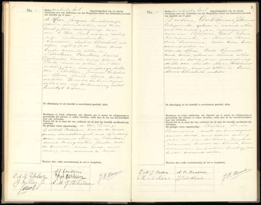 No. 11 Heden drieen twintig April negentienhonderd een en veertig verschenen voor mij, Ambtenaar van den Burgerlijken Stand van Amsterdam, ten einde een huwelijk aan te gaan: de Heer, Jacques, handelsreizigen geboren en wonende alhier, oud zes en twintig jaar, meerderjarige zoon van: de Heer Izak oud een en zestig Jaar. instrumentmaker, en Landwees Sophia Elisabeth, oud achten vijftig jaar zonder beroep beiden wonende alhier, en. Titulaer, Carolina Anna Gertrudis, zonder beroep, geboren te ento wonende alhier oud twee en dertig jaar, meerderjarige dochter van: Titulaer, Joannes Hubertus en: Maas, Anna Maria beiden overleden. De ouders des bruidegoms verklaarden mij toestemming tot dit huwelijk te geven. De afkondiging tot dit huwelijk is onverhinderd geschied, alhier Bruidegom en bruid verklaarden mij, elkander aan te nemen tot echtgenooten en getrouwelijk alle plichten te zullen vervullen, welke door de wet aan den huwelijken staat zijn verbonden. Daarop heb ik, in naam der wet, verklaard, dat zij door het huwelijk aan elkander zijn verbonden. Als getuigen waren tegenwoordig: de Heer George GotHlol (Wlhelm, broeder des bruide. goms, handelaagen, oud vijf en dertig jaar, wonende alhier, en: Titulaer, Anna Margaretha Jacoba, ziesten der bruid, zonder beroep, oud veertig jaar, wonende te Venlo.- No. 12 Heden drie en twintig Apul negentienhonderd een en veertig verschenen voor mij, Ambtenaar van den Burgerlijken Stand van Amsterdam, ten einde een huwelijk aan te gaan: Bredero, Dirk Marinus Johannes horlogemaker, geboren en wonende alhier oud vier en dertig jaar, meerderjarige zoon van: Bredero, Dirk Petrus horlogemaker en: Sanders, Beren dina Susanna, zonder beroep beiden wonende alhier, en van der Maas, Cato Henriëtte zonder beroep, geboren en wonende alhier oud een en dertig jaar, meerderjarige dochter van: van der Maas, Wilhelmus stucadoor, wonende alhier, en: Leone Maria Elisabeth, overleden. De afkondiging tot dit huwelijk is onverhinderd geschied, alhier Bruidegom en bruid verklaarden mij, elkander aan te nemen tot echtgenooten en getrouwelijk alle plichten te zullen vervullen, welke door de wet aan den huwelijken staat zijn verbonden. Daarop heb ik, in naam der wet, verklaard, dat zij door het huwelijk aan elkander zijn verbonden. Als getuigen waren tegenwoordig: Bredero Jlida Berendina, zuster des bruidegoms zonder beroep, oud twee en dertig jaar, en: van der Maas, Jacobus Johannes, broeder der bruid, tim- merman, oud acht en twintig jaar beiden wonende alhier AE Landweer var GGr anten C A. G. Situlaer J de Heer Jr. A M J. Aihelaer Junus J R doo O.MJ Breden A: B. Bredero HH vd Mdas J Jdellaas