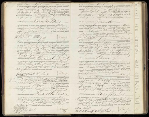 Op heden Twee April Achttienhonderd Zeventig is voor ons ondergeteekende Ambtenaar van den Burgerlijken Stand der Stad Amsterdam, verschenen: Magje ten tlape van beroep vroederuwd oud zesenveertig Jaren, wonende hiinsengracht Buurt Met No. 528, welke heeft verklaard dat in haar bijzijn e dertig Maart l des na middags ten haff acht ure in het huis, staande silantage V.o 191. geboren gen Tind van het Mannelijke geslacht, uit Margaretha Johanna Regina Klinkenbos van beroep geen wonendeGboven 1 welk Kind zal genaamd worden Cornelis Petrus. van welke Verklaring wij deze Akte hebben opgemaakt in tegenwoordigheid van Willem kervooren van beroep timierder oud zesenveertig Jaren, wonende prinsengracht Mi 528 en van Hendrik Willem Loode van beroep geen oud Eenenzestig Jaren, wonende alsbaven en is deze Akte door ons, benevens Melangeetster en de Getuigen, na voorlezing onderteekend. „ ten Hewe W. Vervooren. W Loore Driessen Op heden Twee April Achttienhonderd Zeventig, Jan is voor ons ondergeteekende Ambtenaar van den Burgerlijken Stand der Stad Amsterdam, verschenen:1 Marcus van Graay Jaren, wonende van beroep koopman oud dertigg foeliestraat Buurs 1 No. 2174, welke heeft verklaard dat op len dezer des voor middags ten een Dre, in het huis, staande als boven is geboren een kind van het Vrouwelijke geslacht, uit Ester. Polak. van beroep geen wonende als boven zijne Echtgenoot. welk Kind zal genaand worden Jeannette. van welke Verklaring wij deze Akte hebben opgemaakt in tegenwoordigheid van Motes wol van beroep tabakswerker oud vierenveertig Jaren, wonende rapenbgstraat 1.415en van Adalf walfft van beroep als boven oud zesentwintig Jaren, wonende Dah boven. en is deze Akte door ons, Genevens de Betuigen, na voorlezing onderteekend Verklarende de kompa„ „ranten wegens hunnen Sabbeth met te mo „gen schrijven; goedkeurende de doorhaling „ van drie gedrukte woording Driessen Op heden Twee April Achttienhonderd Zeventig is voor ons ondergeteekende Ambtenaar van den Burgerlijken Stand der Stad Amsterdam, verschenen: latharina de Groot. van beroep vroedvrouw oud zesenvijftig Jaren, wonende nienevenbrugistigg Buurt M No. 438, welke heeft verklaard dat in haar bijzijnt Een dezer des voor middags ten Een ure, in het huis, staande Olofspoort M 322s geboren een And van het Vrouwelijk geslacht, uit Johanna Hendrina Rarf van beroep geen wonende „zender tranr atveren e albeven: Lhuuswouw J Jaas Berend Louiters Zeeman, wonende als de moeder„ welk kind zal genaamd worden Magdalena Cornelia Wubbin van welke Verklaring wij deze Akte hebben opgemaakt in tegenwoordigheid van Heinrich kleinsghmmidt van beroep tapper oud negenenzestig Jaren, wonende Kapelisteeg M 208, en van Willem Perwitr van beroep zeeman oud zevenentwintiaten, wonende Kapelstteeg M 268 en is deze Akte door ons, benovens, de Aangeefster en de Getuigen, na voorlezing onderteekend. 9v4 Driessen F: Kliinschmictt W., Tenvits — Op heden Twee April Achttienhonderd Zeventig is voor ons ondergekechende Ambteraa van den Beijken Stand der Stad Amsterdam, verschenen Hartog Hierman van beroep sigarenmaker oud negenentwintig.- Jaren, wonende Amsttelstraat 3uurt y No. 406, welke heeft verklaard dat op ten dezer des na middags ten halftien ure in het huis, staandeals boven is geboren een kind van het Mannelijke geslacht, uit Henriëtte Roozeboom. van beroepgeen wonende als boven zijne Echtgenoot welk Kind zal genaand worden Eliazer. van welke Verklaring wij deze Akte hebben opgemaakt in tegenwoordigheid van Tamton van Voogen van beroep diamantslijpe oud tweeendertig Jaren, wonende breedsstraat C. 13. en van Starc de Vries van beroep als boven oud dertig Jaren, wonende Bertstraat W. 399 en is, deze Akte door ous, benenens de Getuigen, na voorlezng onderteekend. Verklarende de Kompa„ „ranten wegens kunnen sabbath niet te mogen „schrijven /: goedbeurende de doorhaling zap drie Driessen „gedruik te woorden. Gn heb. ers. Op heden Twee April Achttienhonderd Zeventig, a is voor dns ondergeteekende Ambtenaar van den Burgerijnen Stand der StadAmsteraam, verschenen: Carel Everhardus Mylet de S., Aubin„ van beroep kantoorbediende oud Eenendertig Jaren, wonende schuttingpan Buurt Kn, No. 311., welke heeft verklaard dat 1Heden de voor middags ten tien ure, in het huis, staande als bovenis geboren een Kind van het mannelijke geslacht, uit Femmina Luyman. van berdep geen wonende aesboven: zijne Echtgenoot. welk Kind zal genaamd worden Hendrik Lambertus. van welke Verklaring wij deze Akte hebben opgemaakt in tegenwoordigheid van Dirk Militdestkubin van beroep geen oud vijfenvijftig Jaren, wonende boumstraat pp 622. en van Hendricus Lambertus Ode van beroep timmerman oud dertig Jaren wonende ngstieg f. 281 en is deze Akte door ens, benevens den Vader en de Getuigen, ta voorlezing onderteekend D Driessen D WWelet &estetubur H. L Odo Op heden Twee Chril Achttienhonderd teventig is voor ons ondergeteekende Ambtenaar van den Burgerlijken Stand der Stad Amsterdam, verschenen. Jan de oogd. van beroep werkman oud Eenenveertig Jaren, wonende Pangeleidirte destraat puurt C C No. 394, welke heeft verklaard dat op Heden des voor middags ten drie ure, in het huis, staande alsbaaen is geboren een kind van het Mlannelijke geslacht, uit Jansje van Strate van beroep geen voren als hovenvzijne Echtgenoot. welk Kind zal genaamd worden Petrus Johannes. van welke Verklaring wij deze Akte hebben opgemaakt in tegenwoordigheid van Hendrik Vander Vaaij van beroep merkman oud vijftig Jaren, wonende tuinstraat 00 82 en van Cornelis trederik Hendrik Wichser van beroep zeeman oud tweeendertig Jaren, wonende Aujiliersstraat 60 677, en is deze Akte door ons, beterens den vader en de Getuigen, na voorlezing onderteekend. J: de Vosgd Dreessen H V D Rauij C F H Wichser