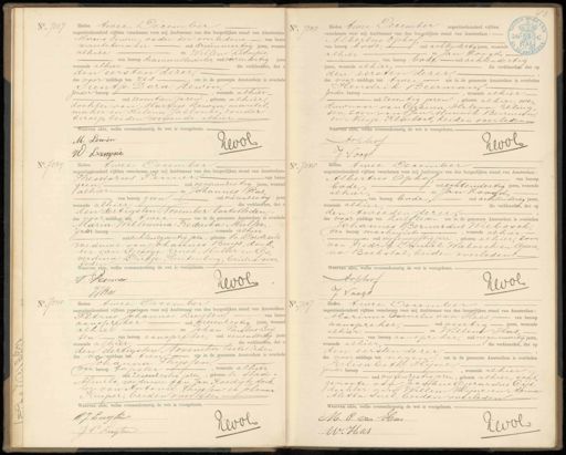 No. 7237 Heden twee December negentienhonderd vijftien verschenen voor mij Ambtenaar van den burgerlijken stand van Marius Lewn, vader der overledene van bero mantelmaker oud drieenveertig jaren, wonend alhier en Willem Lampie, van beroep diamantbewerker, oud vierendertig jare wonende alhier de verklaarden, dat den eersten dezerdes voor middags ten zes ure in de gemeente Amsterdam is overled Sientje Dora Hewm zonder beroep, wonende alhier oud zeventien jaren, geboren alhier dochter van Marcus Lewm, mantelmaker en Helena Jablonke, zonder beroep, beiden wonende alhier Waarvan afte, welke overeenkomstig de wet is voorgelezen. M. Lewin Eevol W Zmne No. 7273 Heden twee December negentienhonderd vijfien verschenen voor mij Ambtenaar van den burgerlijken stand van Amsterdam: Albertus Ophof, van beroep bode, oud achtendertig jaren, wonende alhier en Jan Voogd,— van beroep bode oud achtendertig jaren, wonende alhier, die verklaarden, dat op den eersten dezer des voormiddags ten twee ure in de gemeente Amsterdam is overleden Hendrik Beerman, zonder beroep, wonende alhier — oud zeventig jaren, geboren alhier weduwnaar van Gezina Helena Elling, sen, zoon van Jan Munnik Beerman, en Niesje Klinkert, beiden overledenWaarvan akte, welke overeenkomstig de wet is voorgelezen. Arphof HWoOl J. Vorg No 7239 Heden twee December negentienhonderd vijftien verschenen voor mij Ambtenaar van den burgerlijken stand van Amsterdam Jheodorus Penner, van beroep geen, oud negenenzestig jaren, wonend alhier en Johannes Ras van beroep geen oud vierenzestig Jare wonende alhier die verklaarden, dat o den dertigsten November laatstleden. des voormiddags ten twee ure in de gemeente Amsterdam is overlede Maria Willemina Frederika Muller, zonder beroep, wonende alhier oud achtenzeventig jaren, geboren te Dordrecht weduwe van Johannes Buijs, doch ter van George Ernst Muller en Goverdina Dirkje Ruitenberg, beiden over leden.— Waarvan akte, welke overeenkomstig de wet is voorgelezen. J Senmer MvOl JJKas Heden twee December negentienhonderd vijftien verschenen voor mij Ambtenaar van den burgerlijken stand van Amsterdam: Albertus Ophaj van beroep bode oud achtendertig jaren, wonende alhier, en Jan Voogd -van beroep bode oud achtendertig jaren wonende alhier, die verklaarden, dat op den tweeden dezer, des voor middags ten half zeven ure in de gemeente Amsterdam is overleden Johannes Bernardus Wiebosch, van beroep machinist, wonende alhier -oud vijfenvijftig jaren, geboren alhier, zoon van Fredrik Daniel Wiebosch en Gesiena Boekstal, beiden overleden. Waarvan akte, welke overeenkomstig de wet is voorgelezen. Arphrs Levols J. Voogd No. 7241 Heden twee December negentienhonderd vijftien verschenen voor mij Ambtenaar van den burgerlijken stand van Amsterdam Petrus Johannes Luijten, van beroe aanspreker oud vierenzestig jaren, wonene alhier en Johan Paulus Luijten van beroep aanspreker, oud eenendertig jaren wonende alhier de verklaarden, dat of den dertigsten November laatstleden des na middags ten tien ure in de gemeente Amsterdam is overlede JJohanna Thijsjen, van beroep tapster, wonende alhier oud zesenzestig jaren, geboren te stad Almelo, weduwe van Jan Koedyk, dochter van Antonie Thijssen en Johanna Kuiper, beiden overleden Waarvan akte, welke overeenkomstig de wet is voorgelezen. P J Luyten Levols J. V Luyten Heden twee December negentienhonderd vijftien verschenen voor mij Ambtenaar van den burgerlijken stand van Amsterdam: Marinus Cornelis van Hees van beroep aanspreker, oud veertig Jaren, wonende alhier, en Willem Has van beroep aanspreker, oud negenenveertig jaren, wonende alhier, die verklaarden, dat op den eersten dezerdes voormiddags ten negen ure in de gemeente Amsterdam is overleden Elisabeth Hine,— zonder beroep, wonende alhier - oud vijfenzestig jaren, geboren alhier, echtgenoote van Jacobus Gerardus Cys, dochter van Willem Hijne en Anna Alesta Snel, beiden overleden Waarvan akte, welke overeenkomstig de wet is voorgelezen. M. C. van Hees Keols W Has