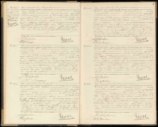 No. 6433. De doorhaling van vyf gedrukte woorden, in akte, goedgekeurd nevens staande. Pvijfstra Jd Geroepen Keol No 6055 Heden vierentwintig Augustus- „negentienhonderd achttien verschenen voor mij Ambtenaar van den burgerlijken stand van A Sijl Spykstra van beroep kleerpraker oud veertig jaren, wonende alhier, en Petrus Apnoldus Sierveijzer van beroep aanspreker oud tweeendertig jaren, wonende alhier die verklaarden, dat op den drieentwintigsten dezer, des voor middags ten half twee ure, in de gemeente Amsterdam is overlede Elisabeth Pieternella van Vlimmeren zonder beroep, echtgenoote van, wonende Sije Spijkstra„ kleermaker, oud wonende alhier, geboren is bevallen van een kind, dat zij als Levenloos aangeven. Waarvan akte, welke overeenkomstig de wet is voorgelezen. SChyhstra Kvols P.H Vierseijze No. 6061 Heden vierentwintig Augustus negentienhonderd achttien verschenen voor mij Ambtenaar van den burgerlijken stand van Amsterdam, Anton Jacobus Belser, van beroep aanspieker, oud eenenveertig- jaren, wonende alhier, en Christiaan Jacob Belser, oud vierenzeventig jaren van beroep geen, wonende alhier die verklaarden, dat op den tweeëntwintigsten dezer, des na middags ten vijf ure, in de gemeente Amsterdam is overleden Adriana van Limbeek zonder beroep, wonende alhier oud drieentwintig jaren, geboren te stad Almelo, echtgenoote van Engelbertus Johannes Mensink dochter van Johannes van Limbeek, agent van politie en Willemina Helena Meyerzonder beroep, beiden wonende te Almelo Waarvan akte, welke overeenkomstig de wet is voorgelezen. A Belser Kevol Chr J Beher No. 6057. Heden vierentwintig Augustus negentienhonderd achttien verschenen voor mij Ambtenaar van den burgerlijken stand van Amsterdam: Johannes van Ark, van beroep aanspelker oud eenenvijftig jaren, wonende alhier, en Fanciscus Bonsen van beroep aanspieker oud eenenveertig jaren wonende alhier die verklaarden, dat op den tweeëntwintigsten dezer des voor middags ten een ure, in de gemeente Amsterdam is overleden Adriana Johanna Cornelia Persenaire zonder beroep, wonende alhier oud achtentwintig jaren, geboren alhier, dochter van Johannes Leonardus Persenairé en Maria Sophia Agneta Bödeker, beiden zonder beroep, en wonende alhier. Waarvan akte, welke overeenkomstig de wet is voorgelezen. JoArkk Keol F, Boens No. 6063. Heden vierentwintig Augustus negentienhonderd achttien verschenen voor mij Ambtenaar van den burgerlijken stand van Amsterdam Anton Jacobus Belser van beroep aanspiker oud eenenveertig jaren, wonende alhier en Christiaan Jacob Belser van beroep geen, oud vierenzeventig jaren wonende alhier, die verklaarden, dat op den tweeentwintigsten dezer des voor middags ten half twaalf ure, in de gemeente Amsterdam is overleden Robert Olboeter van beroep hunstschilder, wonende alhier, oud achtenzestig jaren, geboren te straalsunt in Duitschland, echtgenoot van Georgina Hinse zijnde verdere opgaven den aangevers niet bekend Waarvan akte, welke overeenkomstig de wet is voorgelezen. A Belser Keol Chr J Beler No. 6059. Heden vierentwintig Augustus negentienhonderd achttien verschenen voor mij Ambtenaar van den burgerlijken stand van Amsterdam, Anton Jacobus Belser, van beroep aanspreker, oud eenenveertig jaren, wonende alhier, en Christiaan Jacob Belser, van beroep geen, oud vierenzeventig jaren wonende alhier, die verklaarden, dat op den tweeentwintigsten dezer des voor middags ten halfzes ure, in de gemeente Amsterdam is overleden Elbert Folkerts van beroep kantoorbediende, wonende te Gronijnger oud dertig jaren, geboren te staphoost echtgenoot van Cornelia Willemina van de Berekamp, zoon van Willem Kolkerts overleden en Maria van de Berekamp, zonder beroep, wonende te Nijkerk Waarvan akte, welke overeenkomstig de wet is voorgelezen. Aa Beker. HWol Chv Beler No. 6065 Heden vierentwintig Augustus negentienhonderd achttien verschenen voor mij Ambtenaar van den burgerlijken stand van Amsterdam Evert van Duijkeren, van beroep opzichter oud zesendertig jaren, wonende alhier en Willem van der Marel van beroep opzichter oud vierendertig jaren wonende alhier, die verklaarden, dat op den drie entwintigsten dezer des na middags ten halffen ure, in de gemeente Amsterdam is overleden Wilhelmina Staal zonder beroep, wonende alhier, oud vier maanden, geboren alhier, dochter van Ferdinand Staal, huisschilder en Tryntje van der Dols, zonder beroep, beiden wonende alhier. Waarvan afte, welke overeenkomstig de wet is voorgelezen. C v Duijker Keool W. v JMarl
