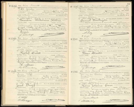 No 1292 Heden tren Maart negentienhonderd twee en dertig verschenen voor mij Ambtenaar van den burgerlijkens Filts Spook van beroep aanspreker oud een en zestig jaren, wonende alhier on Gijsbert Toorenbwyk van beroep aanspreker oud twee en zeventig jaren wonende alhier— die verklaarden, dat op negen dezer. des voor middags ten tien ure, in de gemeente Amsterdam is overleden Scarendina Dilhelmina Kollner zonder beroep, wonende alhier oud negen en zestig jaren, geboren alhier, echtgenoote van Jacobus Frederik Fran- ciscus Bosch, dochter van Matthys Barend Collper en Gieltie- de Moor, beiden overleden Waarvan akte, welke overeenkomstig de wet is voorgelezen. Aunpook Grouwer G Pooienburgh No. 1298 Heden tien Maart negentienhonderd twee en dertig verschenen voor mij Ambtenaar van den burgerlijken stand van Ams bode „ vn tere Sinon Bonn oud zeven en vijftig jaren, wonende alhier en Frans Bruys van beroep aanspreker oud drie en viftig jaren wonende alhier. die verklaarden, dat op negen dezer des voor middags ten tien ure, in de gemeente Amsterdam is overleden amuel Douthuijsen van beroep commissionnair in diamant, wonende alhier oud een en zeventig jaren, geboren alhier, echtgenoot van Lea Mok zoon van Meijer Levie Wouthuijsen en Betje de Smitt, beiden overleden Waarvan akte, welke overeenkomstig de wet is voorgelezen. bnouwer S Bor No. 1294 Heden dien Maart negentienhonderd twee en dertig Gerschenen voor mij Ambtenaar van den burgerlijken stand van Amsterdam: Hermanus Spaar van beroep aanspreker oud vijf en vijftig jaren, wonende alhier en Barend toorenburg van beroep aanspreker oud achtig jaren wonende alhier. die verklaarden, dat of