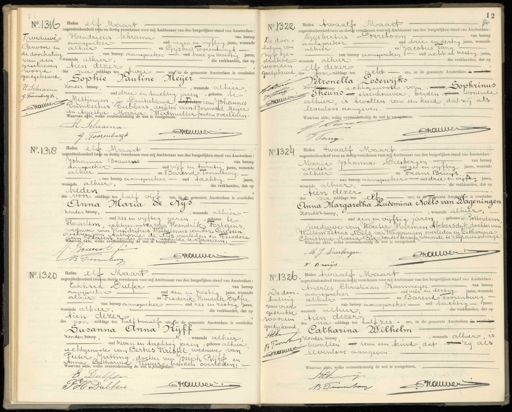 Heden twaalf Maart negentienhonderd twee en dertig verschenen voor mij Ambtenaar van den burgerlijken stand van Amste Gijsbertus Dorreboom van beroep aanspreker oud drie en dertig jaren, wonende alhier en Jacobus Jang wonende alhier die verklaarden, dat op van beroep aanspreker oud acht en zestig jaren, Petronella Lesewijks Elf dezer voor middags ten acht ure, in de gemeente Amsterdam is e zonder roop, echtgenoote van, vorende Sophrinus Theuns on steenhouwer, beiden, geboren wonende alhier, is bevallen van een kind dat zij als levenloos aangeven. Waarvan akte, welke overeenkomstig de wet is voorgelezen. J. Birreg brauver Voing No. 1318 Heden elf Maart negentienhonderd twee en dertig verschenen voor mij Ambtenaar van den burgerlijken stand van Amsterdam: Johannes Bouwens van beroep tanspreker oud vijf en twintig jaren, wonende alhier en Barend Voorenburg- . van beroep aanspreker oud tachtig jaren, wonende alhier. die verklaarden, dat op — heden des voor middags ten half vijf ure, in de gemeente Amsterdam is overleden Anna Maria de Nys zonder beroep,, wonende, alhier oud zes en vijftig jaren, geboren t Haarlem, echtgenooten van Hendrik Fortgens. weduwe van Hendrikus Wilhelmus van der Giessen dochter van Anthonie de Aus overleden en Theodora nvan laten zonder beroep wonende te Haarlem.- van akte, welke overeenkomstig de wet is voorgelezen. J: Boeeus bnouwer B Peovenbugg No. 1324 Heden twaalf Maart negentienhonderd twee en deftig verschenen voor mij Ambtenaar van den burgerlijken stand van Amsterdam: Maria Johanna Liesbergen van beroep zonder oud zes en vyftig jaren, wonende alhier en Frans Bruys van beroep aanspreker oud drie en vijftig jaren die verklaarden, dat op wonende alhier. tien dezer des na middags ten elf ure, in de gemeente Amsterdam is overleden Anna Margarelha Ludemina Aoels van Lageningen zonder beroep,, wonende alhier oud een en vijftig jaren, geboren te Rotterdam weduwe van Houter Herman Akkersdijk dochter van Willem Petrus Noëls van Wageningen overleden en Catharina hristina Maria Bar, zonder beroep, wonende te 's Gravenhage Waarvan akte, welke overeenkomstig de wet is voorgelezen. M J. Diesbergen Grouver F Bruys No. 1320 Heden Elf Maart negentienhonderd twee en dertig verschenen voor mij Ambtenaar van den burgerlijken stand van Amsterdam; Ekhard Zulfer van beroep aanspreker oud een en zestig jaren, wonende alhier en Frederik Hendrik Dulfer van beroep aanspreker oud zes en zestig jaren wonende alhier, die verklaarden, dat op tien dezer des voor middags ten half twaalf ure, (in de gemeente Amsterdam is overleden Susanna Anna Rijpp. zonder beroep,, wonende alhier oud zeven en tachtig jaren, geboren alhier Aechtgenoote van Bertus Kristel weduwe van Pieter Jutting, dochter van Joseph Rijff en Anna Catharina veuger, beiden overleden: Waarvan akte, welke overeenkomstig de wet is voorgelezen. Ee Dulfeln Briouwer S H Dulfen No. 1326 De door- haling van vier gedrukte woorden goedgekeurd. Alten