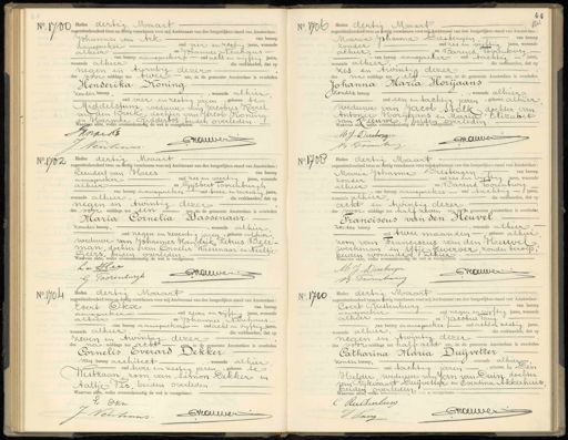 No 1700 Heden dertig Maart negentienhonderd twee en dertig verschenen voor mij Ambtenaar van den burgerlijken stand van Amsterdam Johannes van Ark van beroep aanspreker oud vier en zestig jaren, wonende alhier en Johannes Neuhausvan beroep aanspreker oud acht en vijftig jaren wonende alhier, die verklaarden, dat op negen en twintig dezer des voor middags ten Alvle ure, in de gemeente Amsterdam is overleden Henderika Koning varen alhier zonder beroep, oud vier en zestig jaren, geboren te Middelstum, weduwe van Jacobus Karel van den Broek„dochter van Jacob Koning en Harmke Ridderbos, beiden overleden.Waarvan akte, welke overeenkomstig de wet is voorgelezen. nnaK2 Erieuwer Nentrans No. 1706 Heden dertig Maart negentienhonderd twee en dertig verschenen voor mij Ambtenaar van den burgerlijken stand van Amsterdam: Maria Johanna Diesbergen, van beroep zonder oud zes en vijftig jaren, wonende alhier, en Barend Voorenburg van beroep aanspreker oud tachtigjaren wonende alhier, die verklaarden, dat op zes en twintig dezer des na middags ten elfd ure, in de gemeente Amsterdam is overleden Johanna Maria Horijaans zonder beroep, wonende alhier — oud een en tachtig jaren, geboren alhier weduwe van Jacob Stolk dochter van Antonie Horijaans en Maria Elizabet van Veeuwe beiden Waarvan akte, welke overeenkomstig de wet is voorgelezen. Cleden M J. Disbergen Brauver B Torenbuug No. 1702 Heden dertig Maart negentienhonderd twee en dertig verschenen voor mij Ambtenaar van den burgerlijken stand van Amsterdam: Leendert van Hees van beroep aanspreker oud zes en veertig jaren, wonende alhier en Gijsbert Toorenburgh van beroep aanspreker oud twee en zeventig jaren wonende alhier, die verklaarden, dat op negen en twintig dezer des voor middags ten een ure, in de gemeente Amsterdam is overleden Maria Cornelia Dassenaar zonder beroep,, wonende alhier oud negen en zeventig jaren, geboren alhier weduwe van Johannes Hendrik Petrus Beer man, dochter van Cornelis Wassenaar en Neeltje Geers, beiden overleden Waarvan akte, welke overeenkomstig de wet is voorgelezen. L v Heer Vnieuwer G. Toorenburgh No 1708 Heden dertig Maart negentienhonderd twee en dertig verschenen voor mij Ambtenaar van den burgerlijken stand van Amsterdam: Maria Johanna Liesbergen. van beroep zonder oud zes en vijftig jaren, wonende alhier en Barend sorenburg van beroep aanspreker oud tachtig — jaren wonende alhier, die verklaarden, dat op acht en twintig dezer des voor middags ten half zeven ure, in de gemeente Amsterdam is overleden Franciscus van den Heuvel zonder beroep, wonende alhier oud twee maanden geboren alhier zoon van Franciscus van den Heuve werkman en Ytje Zwerver, zonder beroep, beiden wonende alhier Waarvan akte, welke overeenkomstig de wet is voorgelezen. M J. Diesbergen Grrauver B Toorenbure No. 1704 Heden dertig Maart negentienhonderd twee en dertig verschenen voor mij Ambtenaar van den burgerlijken stand van Amsterdam: Cvert Okx van beroep aanspreker oud zeven en vijftig jaren, wonende alhier en Johannes Neuhaus van beroep aanspreker oud acht en vijftig jaren wonende alhier, die verklaarden, dat op zeven en twintig dezer des na middags ten acht ure, in de gemeente Amsterdam is overleden Cornelis Everard Lekker van beroep architect, wonende alhier oud twee en zestig jaren, geboren te Westzaan, zoon van Simon Dekker en Aaltje Vis, beiden overleden. Waarvan akte, welke overeenkomstig de wet is voorgelezen E Okn Brrouwer Neuhans No. 1710 Heden dertig Maart negentienhonderd twee en dertig verschenen voor mij Ambtenaar van den burgerlijken stand van Amsterdam: Coert OJustenburg van beroep aanspreker oud negen en vijftig jaren, wonende alhier en Jacobus Vang van beroep aanspreker oud acht en zestig jaren wonende alhier, die verklaarden, dat op negen en twintig dezer des voormiddags ten half acht ure, in de gemeente Amsterdam is overleden Catharina Maria Duijvelter zonder beroep, wonende alhier -oud tachtig jaren, geboren te Den Helder weduwe van Jan van Duin dochter van Rijkwaart Duijvetter en Everdina Akkerhuis beiden overleden: „ ie voorgelezen. Waarvan akte, welke overeenkopp C Rustenburg Criouver o/ Vang