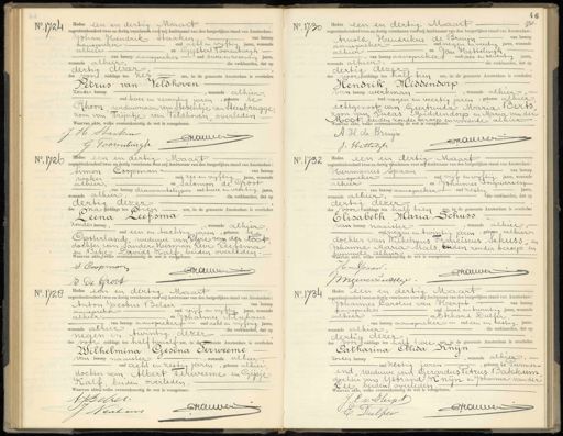 No 1724 Heden een en dertig Maart negentienhonderd twee en dertig verschenen voor mij Ambtenaar van den burge Johan Hendrik Staaken. van beroep aanspreker oud acht en vijftig jaren, wonende alhier en Gysbert Toorenburgh- van beroep aanspreker oud twee en zeventig jaren wonende alhier, die verklaarden, dat op dertig dezer.— des voor middags ten zes ure, in de gemeente Amsterdam is overleden 4 Petrus van Geldhoven zonder beroep, wonende alhier oud twee en zeventig jaren, geboren te Rhoon weduwnaar van steventje van Steenbrugge zoon van Trijntje van Veldhoven, overleden: Waarvan akte, welke overeenkomstig de wet is voorgelezen. H. Staaken Ekaners G. Voorenburgh No. 1730 Heden een en dertig Maart negentienhonderd twee en dertig verschenen voor mij Ambtenaar van den burgerlijken stand van Amsterdam: Arnold Hendrikus de Bruin van beroep aanspreker oud negen en veertig jaren, wonende alhier en Jan Hettelingh -van beroep aanspreker oud vier en zeventig jaren die verklaarden, dat op wonende alhier. dertig dezer des voor middags ten half tien ure, in de gemeente Amsterdam is overleden Hendrik Misdendorp van beroep werkman, wonende alhier oud negen en veertig jaren, geboren alhier echtgenoot van Geertruida Maria Berts zoon van Lucas Middendorp en Maria van der Moot, beiden zonder beroep en wonende alhier Waarvan akte, welke overeenkomstig de wet is voorgelezen. A:H. de Bruyn ekauver J: Hettelyk No. 1726 Heden een en dertig Maart negentienhonderd twee en dertig verschenen voor mij Ambtenaar van den burgerlijken stand van Amsterdam, simon Coopman van beroep waker oud zes en vijftig jaren, wonende alhier, en Salomon de Groot van beroep diamantslijker oud twee en veertig jaren die verklaarden, dat op wonende alhier dertig dezer des nna middags ten Stien ure, in de gemeente Amsterdam is overleden Leena Leepsma zonder beroep,, wonende alhier oud een en tachtig jaren, geboren te Opsterland, weduwe van bevre van der Noot dochter van Sander Herman Levi Leetsma en Betje Davids Kalf beiden overleden. Waarvan akte, welke overeenkomstig de wet is voorgelezen. S: Coopman Bauven zoot No. 1732 Heden een en dertig Maart negentienhonderd twee en dertig verschenen voor mij Ambtenaar van den burgerlijken stand van Amsterdam” Hermanus Spaan van beroep aanspreker oud vijf en vijftig jaren, wonende alhier en Johannes ongeversen van beroep aanspreker oud zestig jaren, wonende alhier. die verklaarden, dat op dertig dezer