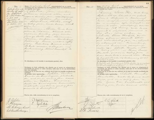 No. 17 No. 17 Echtscheiding uitge- sproken by vornes der Rechtbank te Amsterdam van 11 Juli 1946 ingeschreven te Amsterdam heden 18 October 1946 Pelen Heden vierentwintig April negentienhonderd een en veertig verschenen voor mij, Ambtenaar van den Burgerlijken Stand van Amsterdam, ten einde een huwelijk aan te gaan: Zylstra, Jan, monteur, negen en twintig jaar, meerderjarige geboren en wonende alhier, oud zoon van: Zijlstra, Jan overleden en: Schrijnhout Martha, oud vijf en zestig jaar, zonder beroep, wonende alhier, en. Laverman,. Alida, zonder beroep geboren te Staveren, wonende allier oud een en twintig jaar, meerder. jarige dochter van: Laverman Bruin, overleden, en: Rustenburg. Catharina. Anna, oud zes en vijftig jaar, zonder beroep wonende alhier. De beide moeders verklaarden mij toetemming tot dit huwelijk te geven. De afkondiging tot dit huwelijk is onverhinderd geschied, alhier Bruidegom en bruid verklaarden mij, elkander aan te nemen tot echtgenooten en getrouwelijk alle plichten te zullen vervullen, welke door de wet aan den huwelijken staat zijn verbonden. Daarop heb ik, in naam der wet, verklaard, dat zij door het huwelijk aan elkander zijn verbonden. dds getuigen waren tegenwoordig: Zijlstra, Paulus broeder des bruidegoms, fabrieksarbei„ der oud een en veertig jaar, wonende alhier, en: Zijlstra Everdina zuster des bruidegoms kraamvrouwen verpleegster, oud twee en veertig jaar wonende te Amersfoort. Waarvan akte, welke overeenkomstig de wet is voorgelezen. No. 18 Heden dertig spul negentienhonderd een en veertig een huwelijk aan te gaan: verschenen voor mij, Ambtenaar van den Burgerlijken Stand van Amsterdam, ten einde Thoeng, Sion Kie, zonder beroep blijkens akte van bekendheid van geboorte geboren te Makassar in Nederlandsch Indie op vijf Januari negentienhonderd zes en mitsdien vijf en dertig jaar oud wonende alhier, meerderjarige zoon van Thoeng, Iek Liong, zonder beroep wonende te Makassar voornoemd en Lie Lian Tjioe overleden, en. Schutte Louise Charlotte, zonder beroep, geboren en wonende, alhier oud acht en twintig jaar, van echtgesche den echtgenoote van: Kroonenberg, Edmond Ludovicies meerderjarige dochter van Schutte, Cornelis oud een en zestig Jaar. - en Koers, Louise Charlotte, oud een en zestig jaar. beiden zonder beroep en wonende alhier, de ouder der bruid verklaarden mij toetemming tot dit huwelijk te geven. De afkondiging tot dit huwelijk is onverhinderd geschied, alhier Bij beschikkingder rrondissements Rechtbank alhier, zijn de overgelegd stukken genoegzaam verklaard om tot de voltrekking van het huwelijk over te gaan Bruidegom en bruid verklaarden mij, elkander aan te nemen tot echtgenooten en getrouwelijk alle plichten te zullen vervullen, welke door de wet aan den huwelijken staat zijn verbonden. Daarop heb ik, in naam der wet, verklaard, dat zij door het huwelijk aan elkander zijn verbonden. Als getuigen waren tegenwoordig: Schutte, Cornelia Charlutta, zuster der bruid, zonder beroep, oud een en dertig jaar, en; Sie, T J van Oci, bankbeambte, oud veertig jaar, beiden wonende alhier Waarvan akte, welke overeenkomstig de wet is voorgeleze PVijlsttra J: Zijlstra P. A Laverman. aijl Aia- M Schrijnhout J Maateuw b A Ruitenburg Len C.C. Schutt H.C. Schutte 1:8 GGchusse JCh Koer