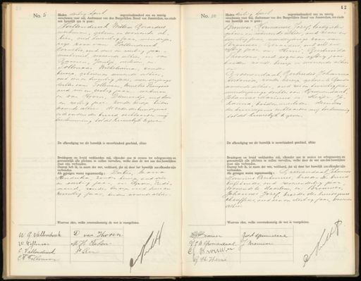 No. 21 Heden dertig April negentienhonderd een en veertig verschenen voor mij, Ambtenaar van den Burgerlijken Stand van Amsterdam, ten einde een huwelijk aan te gaan: Pallenduuk Willem Gerardus werkman, geboren en wonende al„ hier, oud twintig jaar, minderja„ rige zoon van: Vallendiuik Cornelis, oud drie en veertig jaar.- machinist, wonende alhier en van Gaveren, Jantje overleden en: Jollenaar Wilhelmina, zonder beroep, geboren en wonende alhier, oud een en twintig jaar, meerderjarige dochter van: Tollenaar, Cornelis François oud vier en zestig jaar. - werkman en: van Hoorn, Dieuwertje oud twee en zestig jaar- zonder beroep beiden wonende alhier. De vader des buudegoms en de ouders der brund verklaarden mij toestemming tot dit huwelyk te geven. De afkondiging tot dit huwelijk is onverhinderd geschied, alhier Bruidegom en bruid verklaarden mij, elkander aan te nemen tot echtgenooten en getrouwelijk alle plichten te zullen vervullen, welke door de wet aan den huwelijken staat zijn verbonden. Daarop heb ik, in naam der wet, verklaard, dat zij door het huwelijk aan elkander zijn verbonden. Als getuigen waren tegenwoordig: Faber, Maria Hendrika, zonder beroep, oud vier en veertig jaar, en Groen, Ferdi„ nand, zonder beroep, oud twee en zeventig jaar, beiden wonende alhier. Waarvan akte, welke overeenkomstig de wet is voorgelezen. No. 22 Heden dertig April negentienhonderd een en veertig verschenen voor mij, Ambtenaar van den Burgerlijken Stand van Amsterdam, ten einde een huwelijk aan te gaan: Brouwer, Hermanus Jozes, loodgieter geboren en wonende alhier, oud zeven en twintig jaar, meerderjarige zoon van: Brouwer, Gerardus, oud acht en vijftig jaar, en: Herni, Geertruida Theodora oud negen en vijftig jaar beiden zonder beroep en wonende alhier en Groenendaal Gertrudis Johanna Antonia, zonder beroep, geboren te Gouda wonende alhier, oud zes en twintig jaar meerderjarige dochter van, Groenendaal, Johannes Marinus, en: Meijer, I/o„ hanna beiden ooverleden. De ouders des bruidegoms verklaarden mij toestemming tot dit huwelyk te geven. De afkondiging tot dit huwelijk is onverhinderd geschied, alhier Bruidegom en bruid verklaarden mij, elkander aan te nemen tot echtgenooten er getrouwelijk alle plichten te zullen vervullen, welke door de wet aan den huwelijken staat zijn verbonden. Daarop heb ik, in naam der wet, verklaard, dat zij door het huwelijk aan elkander zijn verbonden. Als getuigen waren tegenwoordig: Groenendaal Johannes Marinus Antonius, broeder der bruid Carféhouder, oud zevenendertig jaar wonende te Haarlem, en: Brouwer, Johannes Jozes, broeder des bruidegoms chauffeur, oud een en dertig jaar, wonende alhier Waarvan akte, welke overeenkomstig de wet is voorgelezen. D van Joorn W G Vallenduuk W Tollenaar M.H. Taben- C.Vallendul J Groe CH Tollenaar CBrammer Hes Epaammelaal J J O Choenendaal J Brouwer A Brouwen G. Th Herne