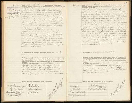 No. 23 IVO. W voonis der rechtbankd Echtschelding uitgesproken bij te msterdam voo 11 december 1969 ingeschreven te An Aeden 15 Juli 7970 Heden dertig April negentienhonderd een en veertig verschenen voor mij, Ambtenaar van den Burgerlijken Stand van Amsterdam, ten einde een huwelijk aan te gaan: Boonstra Gerrits, Jan Hendrik loodgieter, geboren en wonende alhier oud zeven en twintig jaar meerder. jarige zoon van: Boonstra Gerrits, Jan, oud vierenvijftig jaar- magazijnbediende, en: van Delft, Elisabeth Maria, oud zeven en vijftig jaar zonder beroep, beiden wonende alhier en Debens Grietje zonder beroep geboren en wonende alhier oud vijf en twintig jaar, meerderjarige dochter van: Debens, Ringer, oud vijf en vijftig jaar- klinker wonende alhier en van Ankeren, Jansje overleden De ouders des bruidegoms en de vader den bruid verklaarden mij toestemming tot dit huwelijk te geven De afkondiging tot dit huwelijk is onverhinderd geschied, alhier en te bibergen. Bruidegom en bruid verklaarden mij, elkander aan te nemen tot echtgenooten en getrouwelijk alle plichten te zullen vervullen, welke door de wet aan den huwelijken staat zijn verbonden. Daarop heb ik, in naam der wet, verklaard, dat zij door het huwelijk aan elkander zijn verbonden. Als getuigen waren tegenwoordig: van Anderen Haltje, sante der bruid zonder beroep, oud vijf en vijftig jaar en: Debens Jozef, broeden der bruid, scheepsklinker oud een en dertig jaar, beiden wonende alhier Waarvan akte, welke overeenkomstig de wet is voorgelezen. No. 24 Heden dertig April negentienhonderd een en veertig verschenen voor mij, Ambtenaar van den Burgerlijken Stand van Amsterdam, ten einde een huwelijk aan te gaan: Michels Christiaan Frederik, metaalbewerker, geboren en wonende alhier oud drie en twintig jaar, meerderjarige akende zoon van: Michels Christina Elisabeth, oud zeven en veertig jaar zonder beroep, wonende alhier, en: Westhoff Gerritje, zonder beroep geboren te Synezen, wonende alhier oud twee en twintig jaar, meerderjarige dochte van: Westhoff, Louis Willem boekhouder en, Izenbrandt Wille. mina Hendrika, oud negen en veertig jaar, konder beroep, beiden wonende alhier De beide moeders verklaarden mij toestem„ ming tot dit huwelijk te geven. De vader der bruid heeft toetemming verleend bij authentieke akte. De afkondiging tot dit huwelijk is onverhinderd geschied, alhier Bruidegom en bruid verklaarden mij, elkander aan te nemen tot echtgenooten en getrouwelijk alle .plichten te zullen vervullen, welke door de wet aan den huwelijken staat zijn verbonden. Daarop heb ik, in naam der wet, verklaard, dat zij door het huwelijk aan elkander zijn verbonden. Als getuigen waren tegenwoordig: Bustiaans, Adrianus Cornelis munius, oud zeven en zestig jaar, en van der Hilst, Willem, loodgieter, oud vijftig jaar beiden wonende alhier. Waarvan akte, welke overeenkomstig de wet is voorgelezen. J: H: BoonstraGent A Deluns G. Debens A v Anderen Boonstra Gerrit J. Dekens M. V. Defft A.C. Barte P.G. Michelt W van der Hilst G. Kesthoff. E. E Mechels W.H. Izenbrandt