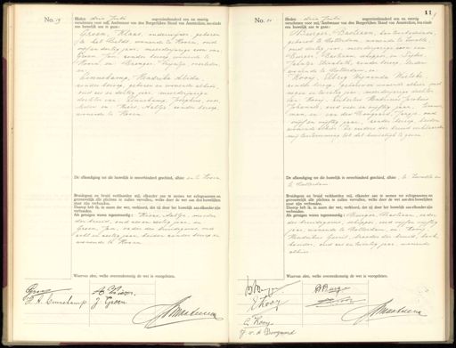 No. 19 Heden drie Juli negentienhonderd een en veertig verschenen voor mij, Ambtenaar van den Burgerlijken Stand van Amsterdam, ten einde een huwelijk aan te gaan: Groen, Klaas, onderwijzer, geboren te het Beldt, wonende te Hoorn, oud vijf en dertig jaar, meerderjarige zoon van Groen. Jan, zonder beroep, wonende te Hoorn, en: Bronger. trijntje, overleden. Ch: Linnekamp, Hendrika Alida zonder beroep, geboren en wonende alhier oud zes en dertig jaar, meerderjarige dochter van: Linnekamp, Josephus, over leden en: Kiers, Aaltje, zonder beroep. wonende te Hoorn. De afkondiging tot dit huwelijk is onverhinderd geschied, alhier en te kooin. Bruidegom en bruid verklaarden mij, elkander aan te nemen tot echtgenooten en getrouwelijk alle plichten te zullen vervullen, welke door de wet aan den huwelijken staat zijn verbonden. Daarop heb ik, in naam der wet, verklaard, dat zij door het huwelijk aan elkander zijn verbonden. Als getuigen waren tegenwoordig: Kiers, Aaltje, moeder der bruid, oud zes en zestig jaar, en Groen, Jan, vader des bruidegoms, oud acht en zestig jaar, beiden zonder beroep en wonende te Hoorn. Waarvan akte, welke overeenkomstig de wet is voorgelezen. No. 20 Heden drie Juli negentienhonderd een en veertig verschenen voor mij, Ambtenaar van den Burgerlijken Stand van Amsterdam, ten einde een huwelijk aan te gaan: Burger, Bastiaan, kantoorbediende geboren te Rotterdam, wonende te Zwolle oud dertig jaar, meerderjarige zoon van Burger, Bastiaan, schipper, en: Sijbes Jaantje Elisabeth, zonder beroep, beiden wonende te Rotterdam, en Kooij, Elbrig Wijnanda Wietske zonder beroep, geboren en wonende alhier oud negen en twintig jaar, meerderjarige doch ter van: Kooij, Dubertus Hendricus Jacobus Johannes, oud vier en vijftig jaar, timmer man, en: van den Boogaard, Jaapje, oud vijf en vijftig jaar, zonder beroep, beiden wonende alhier. De ouders der bruid verklaarde mij toestemming tot dit huwelijk te geven De afkondiging tot dit huwelijk is onverhinderd geschied, alhier, te twolle en te Rotterdam. Bruidegom en bruid verklaarden mij, elkander aan te nemen tot echtgenooten en getrouwelijk alle plichten te zullen vervullen, welke door de wet aan den huwelijken staat zijn verbonden. Daarop heb ik, in naam der wet, verklaard, dat zij door het huwelijk aan elkander zijn verbonden. Als getuigen waren tegenwoordig: Burger, Bastiaan, vader des bruidegoms, schipper, oud vijf en vijftig jaar, wonende te Rotterdam, en: Kooij Hendrikus Gerrit, broeder der bruid, boek„ houder, oud zes en twintig jaar, wonende alhier. Waarvan akte, welke overeenkomstig de wet is voorgelezen. Gron H hurr. B H. A. Linnekamp J: Groen Jmaaleeren J Benger BBurg ƒ1002 JKodz NMaaticena „ C. Kooy„ J. v. d Doogaard