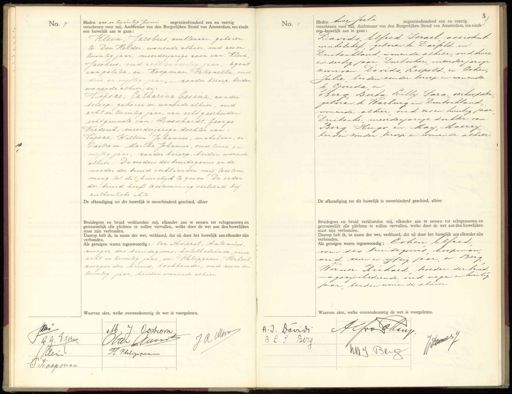 No. 7 Heden zes en twintig Juni negentienhonderd een en veertig verschenen voor mij, Ambtenaar van den Burgerlijken Stand van Amsterdam, ten einde een huwelijk aan te gaan: Klein, Jacobus, ambtenaar, geboren te Den Helder, wonende alhier, oud zes en twintig jaar, meerderjarige zoon van: Klein Jacobus, oud acht en veertig jaar, agent van politie, en: Koopman, Petronella, oud drie en vijftig jaar, zonder beroep, beiden wonende alhier, en Lijsze, Catharina Gesina, zonder beroep, geboren en wonende alhier, oud acht en twintig jaar, van echtgescheiden echtgenoote van: Bosshardt, George Frederik, meerderjarige dochter van: Pijsze, Willem Johannes, makelaar, en Oostrom. Martha Johanna, oud twee en vijftig jaar, zonder beroep, beiden wonende alhier. De ouders des bruidegoms en de moeder der bruid verklaarden mij toestem- ming tot dit huwelijk te geven. De vader der bruid heeft toestemming verleend bij authentieke akte De afkondiging tot dit huwelijk is onverhinderd geschied, alhier Bruidegom en bruid verklaarden mij, elkander aan te nemen tot echtgenooten er getrouwelijk alle plichten te zullen vervullen, welke door de wet aan den huwelijken staat zijn verbonden. Daarop heb ik, in naam der wet, verklaard, dat zij door het huwelijk aan elkander zijn verbonden. Als getuigen waren tegenwoordig: ter Averst, Antonius, zwager des bruidegoms, kotelbediende, oud acht en twintig jaar, en: Phlippeau, Herbert zwager der bruid, boekhouder, oud zeven en twintig jaar, beiden wonende alhier. Waarvan akte, welke overeenkomstig de wet is voorgelezen. No. 8 Heden twee Juli negentienhonderd een en veertig verschenen voor mij, Ambtenaar van den Burgerlijken Stand van Amsterdam, ten einde " een huwelijk aan te gaan: Davids, Alfred Isroel assistent winkelchef, geboren te Darfeld in Duitschland, wonende alhier, oud twee en dertig jaar Duitscher, meerderjarige zoon van: Davids, Leopold, en Cohen Julie, beiden zonder beroep en wonende te Gouda en Berg, Berta Lilly Sara, verkoopster, getoren te Warburg in Duitschland- wonende alhier oud zes en twintig jaar Duitsche meerderjarige dochter van: Berg Hugo en May, Maerry, beiden zonder beroep en wonende alhier De afkondiging tot dit huwelijk is onverhinderd geschied, alhier Bruidegom en bruid verklaarden mij, elkander aan te nemen tot echtgenooten er getrouwelijk alle plichten te zullen vervullen, welke door de wet aan den huwelijken staat zijn verbonden. Daarop heb ik, in naam der wet, verklaard, dat zij door het huwelijk aan elkander zijn verbonden. Als getuigen waren tegenwoordig: Cohen Alfred, oom des tuerde goons koopman oud zeven en vjftig jaar, en Berg Werner Bichard hoeder der bruid nagazijnbediende oud negen en twintig Jaar beiden wonende alhier Waarvan akte, welke overeenkomstig de wet is voorgelezen d Jr J: Ostram Ja M Olter Cnt J. G.G. Vijne H. Phlippen J Vlen I Soopman ACpothus A:J. Davids
