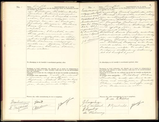 No. 11 Heden twee Juli negentienhonderd een en veertig verschenen voor mij, Ambtenaar van den Burgerlijken Stand van Amsterdam, ten einde een huwelijk aan te gaan: van Everdingen Waltherus Cornelus Synatius Antonius, advocaat en procureur getoren te Oirschot, wonende alhier oud vier en zestig jaar meer „derjarige zoon van: van boerdingen Gysbertus Henricus, en: Heuvelmans Maria Agnes Francisca, beiden overleden en Mijdema, blisabeth zonder beroep, geboren en wonende alhier oud drie en vyftig jaar van echt ge „scheiden echtgenoote van: van Swieten, Pieter Adrianus meerderjarige dochter van: Mijdema, Albert, en Koopman Christina Adriana beiden overleden. De afkondiging tot dit huwelijk is onverhinderd geschied, alhier Bruidegom en bruid verklaarden mij, elkander aan te nemen tot echtgenooten en getrouwelijk alle plichten te zullen vervullen, welke door de wet aan den huwelijken staat zijn verbonden. Daarop heb ik, in naam der wet, verklaard, dat zij door het huwelijk aan elkander zijn verbonden. Als getuigen waren tegenwoordig: Doets Jan advoeaat en procureur oud zeventig jaar, en Mijdema Albert broeder der bruid tramconducteur, oud acht en veertig jaar, beiden wonende alhier Waarvan akte, welke overeenkomstig No. 12 Ecblicheiding uitgesproken bij vonnis der Rechtbank te Amderdam van 20 Novem ber 1947 ingescheeven te Amsterdam heden 1 April 1948 J M Heden twee Juli negentienhonderd een en veertig verschenen voor mij, Ambtenaar van den Burgerlijken Stand van Amsterdam, ten einde een huwelijk aan te gaan: Langenberg, Gerrit caféhouder, geboren te Bansdorp, wonende alhier, oud zeven en twintig jaar van echt gescheiden echtgenoot van: Biggeman, Wilhelmina, meerderjarige zoon van: Langenberg, Gerbrand, oud vier en zestig jaar, werkman en: Westerneng Meintje, oud vyftig jaar, zonder beroep beiden wonende alhier, en Wildbret, Maria Cornelia zonder beroep geborenen wonende alhier oud zeven en dertig jaar van echt gescheiden echtgenoote van Huijper Gerardus meerderjarige dochter van: Wildbret, Casparus zonder beroep, wonende alhier en: Braspenning Cornelia Catharina, overleden. De ouders des bruidegoms verklaarden mij toestemming tot dit huwelijk te geven. De afkondiging tot dit huwelijk is onverhinderd geschied, alhier Bruidegom en bruid verklaarden mij, elkander aan te nemen tot echtgenooten en getrouwelijk alle plichten te zullen vervullen, welke door de wet aan den huwelijken staat zijn verbonden. Daarop heb ik, in naam der wet, verklaard, dat zij door het huwelijk aan elkander zijn verbonden. Als getuigen waren tegenwoordig: Wildbret Helena Hendrika zuster der bruid zonder beroep, oud veertig jaar, en: Grootveld Petrus tafehouder oud vijf en veertig jaar beiden wonende alhier Waarvan akte, welke overeenkomstig de wet is voorgelezen. Wvanweiding Jboch 9 D F Tnijdeme 1 H. van B. Wildbrek G: Langenberg