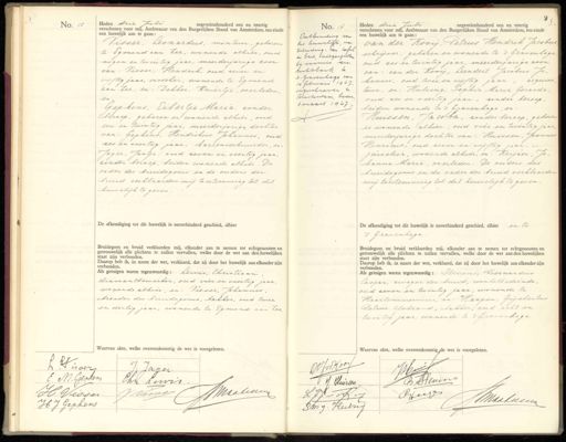 No. 15 Heden drie Juuli negentienhonderd een en veertig verschenen voor mij, Ambtenaar van den Burgerlijken Stand van Amsterdam, ten einde een huwelijk aan te gaan: Visser, Leonardus, monteur, geboren te Egmond van Zee, wonende alhier, ond negen en twintig jaar, meerderjarige zoon van: Visser, Hendrik, oud zeven en vijftig jaar, visscher, wonende te Egmond aan Zee, en: Dekker, kniertje, overleden en: Gepkens, Eibertje Maria, zonder beroep, geboren en wonende alhier, oud een en twintig jaar, meerderjarige dochter van: Gepkens, Hendrikus Johannes, oud zes en veertig jaar. karrenverhuurder, en: Jager. Jantje, oud zeven en veertig jaar. zonder beroep, beiden wonende alhier. De vader des bruidegoms en de ouders der bruid verklaarden mij toestemming tot dit huwelijk te geven De afkondiging tot dit huwelijk is onverhinderd geschied, alhier Bruidegom en bruid verklaarden mij, elkander aan te nemen tot echtgenooten en getrouwelijk alle plichten te zullen vervullen, welke door de wet aan den huwelijken staat zijn verbonden. Daarop heb ik, in naam der wet, verklaard, dat zij door het huwelijk aan elkander zijn verbonden. Als getuigen waren tegenwoordig: Lewver, Christiaan diamantbewerker, oud vier en veertig jaar. wonende alhier, en: Visser, Johannes, broeder des bruidegoms, bakker, oud twee en dertig jaar, wonende te Egmond aan Zee Waarvan akte, welke overeenkomstig de wet is voorgelezen. No. 16 Ontbending van het huwelijk, na scheiding. van tafel en bed, uitgespoken bij vernis der tichtbank te 'ss. Gravenhage van 14 februari 1967. ingeschreven te Amsterdam, heden, 1 maart 1967 Heden drie Juli negentienhonderd een en veertig verschenen voor mij, Ambtenaar van den Burgerlijken Stand van Amsterdam, ten einde een huwelijk aan te gaan: van der Kooij. Petrus Hendrik Jacobus schrijver, geboren en wonende te 's Gravenhage oud zes en twintig jaar, meerderjarige zoon van: van der Kooy, Leendert Jacobus Jo. hannes, oud twee en vijftig jaar, acquiei teur, en: Hulsing, Sophia Maria Gerarda oud zes en veertig jaar, zonder beroep. beiden wonende te 's Gravenhage, en Huissen, Jacoba, zonder beroep, geboren en wonende alhier, oud vier en twintig jaar. meerderjarige dochter van: Huissen, Jrannes Henricus, oud zeven en vijftig jaar. juwelier, wonende alhier, en: Keijzer, Jo- hanna Maria, overleden. De ouders Zes bruidegoms en de vader der bruid verklaarden mij toestemming tot dit huwelijk te geven. De afkondiging tot dit huwelijk is onverhinderd geschied, alhier en te 5 Gravenhage. Bruidegom en bruid verklaarden mij, elkander aan te nemen tot echtgenooten en getrouwelijk alle plichten te zullen vervullen, welke door de wet aan den huwelijken staat zijn verbonden. Daarop heb ik, in naam der wet, verklaard, dat zij door het huwelijk aan elkander zijn verbonden. Als getuigen waren tegenwoordig: Stevens, Bernardus Caspar, zwager der bruid, winkelbediende. oud zeven en twintig jaar, wonende te Haarlemmermeer, en: Haagen, Gijsbertus Petrus Ysbrand, bakker, oud acht en twintig jaar, wonende te 's Gravenhage. Vider 1 J Jager E: M: Gerkens hr heuvis JMMaatenug JIize H Jissen 904 H J Gephens D JooKoon V v B Sevens W Huissen Roage L JJ v o op Jmaaleree PM J: Hulsig 8
