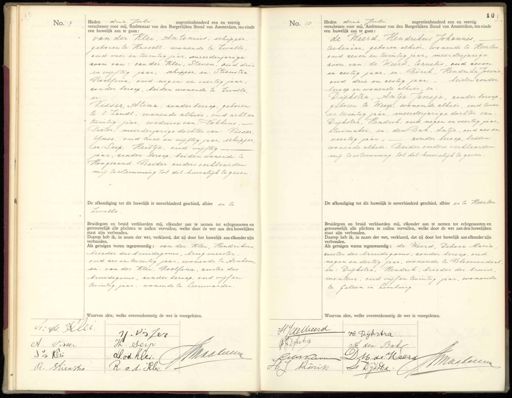 No.117 Heden drie Juli negentienhonderd een en veertig verschenen voor mij, Ambtenaar van den Burgerlijken Stand van Amsterdam, ten einde een huwelijk aan te gaan: van der Klei, Antonius, schipper. geboren te Hasselt, wonende te Zwolle. oud vier en twintig jaar, meerderjarige zoon van: van der Klei, Steven, oud drie en vijftig jaar, schipper, en: Stienstra Roelsina, oud negen en veertig jaar, zonder beroep, beiden wonende te Zwolle, eh: Visser, Stina, zonder beroep, geboren te t Landt, wonende alhier, oud acht en twintig jaar, weduwe van: Fokkens.- Pieter, meerderjarige dochter van: Visser, IJnse, oud twee en vijftig jaar, schipper, en: Seip, Heiltje, oud vijftig jaar, zonder beroep, beiden wonende te Hoogezand. Beider ouders verklaarden mij toestemming tot dit huwelijk te geven: De afkondiging tot dit huwelijk is onverhinderd geschied, alhier en te Zwolle. Bruidegom en bruid verklaarden mij, elkander aan te nemen tot echtgenooten en getrouwelijk alle plichten te zullen vervullen, welke door de wet aan den huwelijken staat zijn verbonden. Daarop heb ik, in naam der wet, verklaard, dat zij door het huwelijk aan elkander zijn verbonden. Als getuigen waren tegenwoordig: van der Klei, Hendrikus broeder des bruidegoms, brugmeester. oud zes en twintig jaar, wonende te Arnhem, en: van der Klei. Koelfina, zuster des bruidegoms, zonder beroep, oud vijf en twintig jaar, wonende te Leeuwarden. Waarvan akte, welke overeenkomstig de wet is voorgeleze No. 18 Heden drie Juli negentienhonderd een en veertig verschenen voor mij, Ambtenaar van den Burgerlijken Stand van Amsterdam, ten einde een huwelijk aan te gaan: de Weerd, Hendrikus Johannes, teekenaar, geboren alhier, wonende te Heerlen oud zeven en twintig jaar, meerderjarige zoon van: de Weerd, Cornelis, oud zeven en zestig jaar, en: Rörik, Hendrika Josina oud drie en zestig jaar, beiden zonder beroep en wonende alhier, en. Dijkstra, Antje Jansje, zonder beroep geboren te Weesp, wonende alhier, oud twee en twintig jaar, meerderjarige dochter van Dijkstra, Hendrik, oud negen en veertig jaar etuimaker, en: den Bak, Antje, oud zes en veertig jaar, zonder beroep, beiden wonende alhier. Beider ouders verklaarden mij toestemming tot dit huwelijk te geven: De afkondiging tot dit huwelijk is onverhinderd geschied, alhier en te Heerlen Bruidegom en bruid verklaarden mij, elkander aan te nemen tot echtgenooten en getrouwelijk alle plichten te zullen vervullen, welke door de wet aan den huwelijken staat zijn verbonden. Daarop heb ik, in naam der wet, verklaard, dat zij door het huwelijk aan elkander zijn verbonden. Als getuigen waren tegenwoordig: de Heerd, Debora Maria ruster des bruidegoms, zonder beroep, oud negen en dertig jaar, wonende te Bloemendaal en: Dijkstra, Hendrik, broeder der bruid, monteur, oud vijf en twintig jaar, wonende te Geleen in hemburg. Waarvan akte, welke overeenkomstig de wet is voorgelezen. F: V4. Klei H: Viser A Virser M Sein Waraleee S va Keei H. vd. Klei R. v.d. Pleink R. Hienstra H JdeMeerd H: Dijkstra J dpet J den Bak D.M. de Heers G Leen De DZasta J Maateum H J Korik