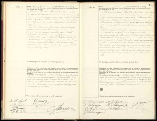 No. 19 Heden drie Juli negentienhonderd een en veertig verschenen voor mij, Ambtenaar van den Burgerlijken Stand van Amsterdam, ten einde een huwelijk aan te gaan: Noest, Karel Hendrik, kleermaker. geboren en wonende alhier. oud een en dertig jaar, meerderjarige zoon van: Noest, Gerar dus Jacobus, kleermaker, wonende alhier. en: Lequé, Cornelia Elisabeth, overleden, en: Riet, Anna Gesina, zonder beroep geboren en wonende alhier, oud twintig jaar, minderjarige dochter van: Riet, Justis, oud vier en vijftig jaar. letterzetter, en: Celie, Jacoba Elisabeth oud twee en vijftig jaar, zonder beroep, beiden wonende alhier. De ouders der bruid verklaarden mij toestemming tot dit huwelijk te geven. De afkondiging tot dit huwelijk is onverhinderd geschied, alhier Bruidegom en bruid verklaarden mij, elkander aan te nemen tot echtgenooten en getrouwelijk alle plichten te zullen vervullen, welke door de wet aan den huwelijken staat zijn verbonden. Daarop heb ik, in naam der wet, verklaard, dat zij door het huwelijk aan elkander zijn verbonden. Als getuigen waren tegenwoordig: Noest, Gerardus Jacobus, broeder des brendegoms, kleermaker, oud drie en veertig jaar, wonende alhier, en: Riet, Gustus Frederik, broeder der bruid, kantoorbediende, oud negen en twintig jaar. wonende te Diemen. Waarvan akte, welke overeenkomstig de wet is voorgelezen. No. 20 Heden negen Juli negentienhonderd een en veertig verschenen vóor mij, Ambtenaar van den Burgerlijken Stand van Amsterdam, ten einde een huwelijk aan te gaan: Hazenindus, Pieter Jacobus, werkm geboren en wonende alhier, oud een en twintig jaar, meerderjarige zoon van: Hazewindus Herman Willem Adriaan, timmerman, en Huisman, Margaretha, oud negen en veertig jaar, zonder beroep, beiden wonende alhier en: Schweiger, Aafje, zonder beroep, geboren en wonende alhier, oud negentien jaar, minderjarige dochter van: Schweiger, Johanne oud een en veertig jaar, tegenhouder en: Greuter, Maria Jacoba, oud negen endertig jaar, zonder beroep, beiden wonende alhier De moeder des bruidegoms en de ouders der bruid verklaarden mij toestemming tot dit huwelijk te geven. De vader des bruidegom heeft toestemming verleend bij authentieke akte. De afkondiging tot dit huwelijk is onverhinderd geschied, alhier Bruidegom en bruid verklaarden mij, elkander aan te nemen tot echtgenooten en getrouwelijk alle plichten te zullen vervullen, welke door de wet aan den huwelijken staat zijn verbonden. Daarop heb ik, in naam der wet, verklaard, dat zij door het huwelijk aan elkander zijn verbonden. Als getuigen waren tegenwoordig: Schweiger, Hendrik oom der bruid, werkman, oud acht en dertig jaar, en: de Waal, Johannes, zweger des bruidegoms, expeditieknecht, oud acht en twintig jaar, beiden wonende alhier. Waarvan akte, welke overeenkomstig de wet is voorgelezen. K H Noert G.J. Woest an P G Riet. A. JMaateug 4 E Celie. JJ. Hazewinders M J. Geeuter. Mum A. Schweiger. H. Schrager Jr. M. Huisman J de Waal J. Schweiger