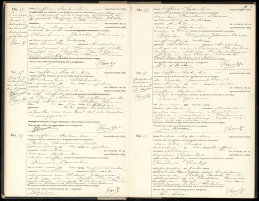 No. 37 Vis door Renvooi en de doorhaling van twee en- dertig woorden goedgekeurd Haart Heden viftien September negentienhonderd vijftig verscheen boor mij, ambtenaar van de burgerlijke stand van Amsterdam: in geschreven een uittreksel uit het register van overlijden der gemeente Voorburg, waarnet blijkt, dat aldaar oud jaar, beroep— wonende te die verklaarde, dat op — dertig Augustus negentienhonderd vijftig te tienbur nel - minuten in de gemeente Amsterdam is overleden: Charbon, Jacoba Johanna - oud zesenzeventig Jaar, zonder beroep geboren te Sassenherm, wonende te Amsterdam gehuwd geweest met: Hanegraaff Willem dochter van: Charbon Jan Adam en van: van der Vlies Maria Adriana, beiden overlesen- De aangever verklaarde uit eigen wetenschap van het overlijden kennis te dragen. Waarvan akte, wolke overoonkomstig de wet is voorgelezen. Haan ƒ90 No. 40 Heden vijftien September negentienhonderd vijftig verscheen voor mij, ambtenaar van de burgerlijke stand van Amsterdam: van den Busken, Maria, oud zesendertig jaar, zonder beroep, wonende te Amsterdam, die verklaarde, dat o veertien September negentienhonderd vijftig tenegen uur dertig minuten in de gemeente Amsterdam is overleden: Schulze, Elisabeth Johanna Maria, oud vijfenvijftig jaar, zonder beroep, geboren te Amsterdam, wonende te Amsterdam echtgenote van: Mooser, Hendrikus dochter van: Schulze, Richard Francois Adolphe en: van Hooven, Elisabeth Hendrika, beiden overleden. De aangever verklaarde uit eigen wetenschap van het overlijden kennis te dragen. Waarvan akte, welke overeenkomstig de wet is voorgelezen. Haan & M. v. d. Busken No. 38 Goedgekeurd. de hoortaling van tweeen twintig voorden GBhum Haanfo Heden vyftien September negentienhonderd vijftig verscheen voor mij, ambtenaar van de burgerlijke stand van Amsterdam: Bleekemolen, Willebrordus oud negenendertig jaar, van beroep aanspreker wonende te Amsterdam die verklaarde, dat of veertien September negentienhonderd vijftig te elf uur vijfenveertig minuten in de gemeente Amsterdam is overleden: de Jong Maria Christina zonder beroep, echtgenote van: Schelling Joannes, oud Jaar van beroep banketbakker geborente beiden wonende te Amsterdam, is bevallen van een kind, dat als levenloos, d aangegeven De aangever verklaarde uit eigen wetenschap van het overlijden kennis te dragen- Waarvan akte, welke overeenkomstig de wet is voorgelezen. Jven Haantes No. 41 Goedgekeurd de doorhaling van één woord H Cive Hun Heden vijftien September negentienhonderd vijftig verscheen voor mij, ambtenaar van de burgerlijke stand van Amsterdam: de Goede, Samuel Leonard oud zesenzestig jaar, van beroep aanspreker, wonende te Amsterdam, die verklaarde, dat o vijftien September negentienhonderd vijftig te pul vur vijftien minuten in de gemeente Amsterdam is overleden: Loois, vonne oud drie dagen jaar, zonder beroep, geboren te Amsterdam wonende te Amsterdam dochter van: Loois, Arnoldus Albertus, monteur, en Heidema Johanna, zonder beroep, beiden wo nende te Amsterdam. De aangever verklaarde uit eigen wetenschap van het overlijden kennis te dragen. Waarvan akte, welke overeenkomstig de wet is voorgelezen. Haart Cbv Aoede No. 39 Heden vijftien September negentienhonderd vijftig, verscheen voor mij, ambtenaar van de burgerlijke stand van Amsterdam: Belser, Christiaan Jacob, oud drieën veertig jaar, van beroep aanspreker wonende te Amsterdam, die verklaarde, dat op Veertien September negentienhonderd vijftig te dertien uur vijftien windten in de gemeente Amsterdam is overleden: Ruurs, Cornelis oud achtenveertig jaar, van beroep expeditiebediende geboren te Amsterdam, wonende te Amsterdam echtgenoot van Schut Johanna Antonesta, zoon van: Ruurs Hendrik, zonder beroep, wonende te Amsterdam en: Douwe„ Johanna Susanna Diliana, overleden De aangever verklaarde uit eigen wetenschap van het overlijden kennis te dragen. Waarvan akte, welke overeenkomstig de wet is voorgelezen. Benes EhJ helse No. 42 Heden zestien September negentienhonderd vijttig verscheen voor mij, ambtenaar van de burgerlijke stand van Amsterdam: van hoo, Pieter, vtitar dng oud zestig jaar, van beroep chanfferir wonende te Amsterdam, veertien September negentienhonderd vijftig te twintig uur dertig minuten in de gemeente Amsterdam is overleden: Versluis, Dirkje ouvijfenzestig jaar, zonder beroep geboren Charlois thans Rotterdam, wonende te Amsterdam, echtgenote van: Roldyk Hendrik David gehuwd geweest wet: van Bokhoven, Henricus, dochter van: Persluis Jan en van oon Wilhelmina beiden overleden De aangever verklaarde uit eigen wetenschap van het overlijden kennis te dragen. Waarvan akte, welke overeenkomstig de wet is voorgelezen. Baantje