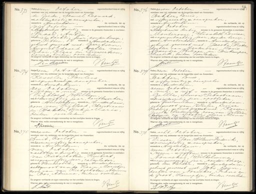 No. 37 Heden zeven October negentienhonderd twee en vijftig verscheen voor mij, ambtenaar van de burgerlijke stand van Amsterdam: de Goede, Samuel Leonard oud achtenzestig ur, aanspreker wonende te Amsterdam, de verklaarde, dat op Vijf October negentienhonderd twee en vijftig te drieentwintig vor twintig winuten in de gemeente Amsterdam is overleden Fraad, Antje oud drie en tachtig jaar, zonder beroep, geboren te Tetten, wonende te Amsterdam gehuwd geweest met: Gerretsen; AugustEdzard dochter van Fraai, Klaas en: Toewertsen. Louiza, beiden overleden De aangever verklaarde uit eigen wetenschap van het overlijden kennis te dragen. Waarvan akte, welke overeenkomstig de wet is voorgelezen. H: Ea Goeder Hoantjs No. 376 Heden zeven October negentienhonderd twee en vijf verscheen voor mij, ambtenaar van de burgerlijke stand van Amsterdam: Bakker, Louis oud vijfenveertig jaar, aanspreker, wonende te Amsterdam, de verklaarde, dat op vijf October negentienhonderd twee en vijftig tezeventien dur dertig windten in de gemeente Amsterdam is overleden Monterossi, Elisabeth Louisa, oud negenentachtig jaar, zonder beroep, geboren te Amsterdam, wonende te Amsterdam gehuwd geweest met: Jacobs Pieter dochter van: Monterosoi, Louis Alexandre Philippe, en: Binkemper Elisabeth, beiden overleden De aangever verklaarde uit eigen wetenschap van het overlijden kennis te dragen. Waarvan akte, welke overeenkomstig de wet is voorgelezen. Cabt Haant No. 374 Hederreven October negentienhonderd twee en vijftig verscheen voor mij, ambtenaar van de burgerlijke stand van Amsterdam: Kesseler Paulus oud negenenzeventig Janr, aanspreker wonende te Amstersam, die verklaarde, dat op zes October negentienhonderd uree en vijftg tevesen- ur nil minuten in de gemeente Amsterdam is overleden rybloed, Willem oud zesenvijftig jaar, houtbewerker geboren te Amsterdam, wonende te Amsterdam, zoon van: Vrijbloed, Christiaan en: Bakker, Dirkje Maria, beiden overleden De aangever verklaarde uit eigen wetenschap van het overlijden kennis te dragen. Waarvan akte, welke overeenkomstig de wet is voorgelezen. Jranses J Kerselel No. 377. Heden zeven October negentienhonderd twee en vijftig verscheen voor mij, ambtenaar van de burgerlijke stand van Amsterdam: Bakker, Louis oud vijfen veertig aar, aanspreker wonende te Amsterdam, de verklaarde, dat op zeven October negentienhonderd twee en vijftig te nub. ur vijf minuten in de gemeente Amsterdam is overleden Gallie, Simon Sebastiaan, oud drie en zeventig jaar, apotheker geboren te isselmunden, wonende te Amsterdam, echtgenoot van: Werler, Luise Hedwig, gebuwd geweest met: Kossen, Jacoba Pietervellg, zoon van: Gallee totopie en Scbober Sara Mins sabina beiden overleden De aangever verklaarde uit eigen wetenschap van het overlijden kennis te dragen. Waarvan akte, welke overeenkomstig de wet is voorgelezen. Haant Agtel No. 375 Heden zeven October negentienhonderd twee en vijfig verscheen voor mij, ambtenaar van de burgerlijke stand van Amsterdam: Smit, Roelof oud zevenenvijftig Jaar, aanspreker wonende te Amsterdam, de verklaarde, dat op vier October negentienhonderd twee en vijfi teachttien ur twintig winuten in de gemeente Amsterdam is overleden van Rietschoten, Huibert, oud negenenvijftig jaar, calsulator, geboren te Heinenoord, wonende te Amstersam, echtgenoot van: de Haan Marietje, zoon van van Rietschoten, Adrianus en: Bos Adriana, beiden overleden. De aangever verklaarde uit eigen wetenschap van het overlijden kennis te dragen. Vaant Waarvan akte, welke overeenkomstig de wet is voorgelezen. W. Mut. No. 378. Heden acht October negentienhonderd twee en vijftig verscheen voor mij, ambtenaar van de burgerlijke stand van Amsterdam: Visser Jan Willem Frederik oud vierenzestig aar, aanspreker wonende te Amsterdam, die verklaarde, dat op zeven October negentienhonderd twee en vijfti tezeven- uur vijftien winuten in de gemeente Amsterdam is overleden Nonnekes, Wilhelmina oud negenennegentig jaar, zonderberoep geboren te Den Heider, wonende te Amsterdam gehuwd geweest met: Jobs, Leijn, dochter van Nonnekes Frans en de Groot, Harmptje, beiden overleden De aangever verklaarde uit eigen wetenschap van het overlijden kennis te dragen. Waarvan akte, welke overeenkomstig de wet is voorgelezen. Arantj JVPW
