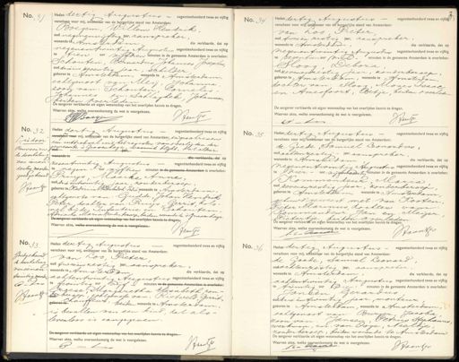 No. 37 Heden dertig Augustus negentienhonderd twee en vijftig verscheen voor mij, ambtenaar van de burgerlijke stand van Amsterdam: Boegem, Willem Hendrik oud negenenvijftig aar, aanspreker wonende te Amsterdam, de verklaarde, dat op negenentwintig Augustus negentienhonderd twee en vijftig te tien uur vijftien minuten in de gemeente Amsterdam is overleden: Schouten, Bernardus Johannes Josephus, oud drieën zeventig jaar, schilder geboren te Amsterdam, wonende te Amsterdam, echtgenoot van: Meij, Johanna zoon van: Schouten, Cornelis- Johannes en: Schlaghek, Johanna, beiden overleden. De aangever verklaarde uit eigen wetenschap van het overlijden kennis te dragen. Waarvan akte, welke overeenkomstig de wet is voorgelezen. Hantto JBoeger No. 34 Heden dertig Augustus negentienhonderd twee en vijftig verscheen voor mij, ambtenaar van de burgerlijke stand van Amsterdam: van Loo, Pieter oud twee en zestig Jaar, aanxpreker, wonende te Amsterdam, de verklaarde, dat op negenentwintig Auquntieg negentienhonderd twee en vijftig te zeventien our niel minuten in de gemeente Amsterdam is overleden: Sloog, Debora oud zevenenzestig jaar, zonder beroep; geboren te Amsterdam, wonende te Amsterdam, dochter van: Sloog, Moses Isaac en Amessoort, Betje, beiden overleden De aangever verklaarde uit eigen wetenschap van het overlijden kennis te dragen. Waarvan akte, welke overeenkomstig de wet is voorgelezen. Htanijs 1s— No. 32 is door Renvooien de doorhaling van eenen dertig woorden goedgekeurd Haantj Heden dertig Augustus negentienhonderd twee en vijftg verschten voor mij, ambtenaar van de burgerlijke stand van Amsterdam: in geschreven een uittreksel uit het register van overlijden der gemeente 's Gravenhage, waaruit blijkt, dat aldaar 7e
