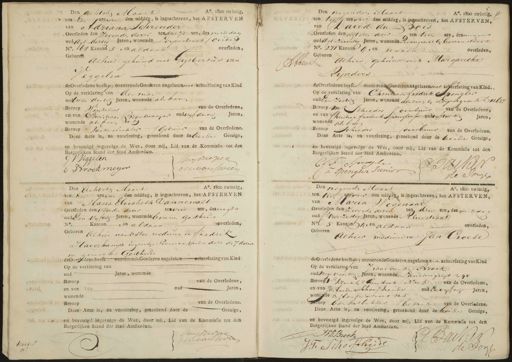 Den achtsten Maart Ao. 1800 Twintig, ten Een Jurena den middag, is ingeschreven, het AFSTERVEN van Adriana Schreuder Overleden den Zevenden dezer ten duig2 ure, des middag oud agt dertig Jaren, wonende Loyenstraat / ouder No. 68 Kanton 5, en aldaar z overleden, Geboren Achier. gehuwd met Gijsbertus van Veggelen de Overledene heeft je, onroerende Goederen nagelatenmet achterlating van Kind, Op de verklaring van den mag oud twee dertig Jaren, wonende als door Beroep Winkelier van de Overledene, en van Christiaan Broekmeijer oud vif dertig Jaren, wonende als boven n 9 Beroep Varkerslichter Gebuur van de Overledene, Deze Acte is, na voorlezing, geteekend door de beide Getuige, en bevestigd ingevolge de Wet, door mij, Lid van de Kommissie, tot den Burgerlijken Stand der Stad Amsterdam. .. Huydriezen G V Veggelen C Broekmeyer crronsween 1 Hbuma Den negenden Maart „ Ao. 1800 twintig. ten tig ure, vin den middag, is ingeschreven, het AFSTER.VEN, van Davide du Bois Overleden den agtsten dezer ten tien ure, des mogens oud agt zeventig Jaren, wonende Princegrocht by beerenstraat No. 271 Kanton 4, en aldaar overleden, Geboren Alhier, gehuwe met Margaritha Rijnders de Overledene heeft Onroerende Goederen higelaten met achterlating van Kind. Op de verklaring van Chintaar Fredrik Spingler oud Een zestig Jaren, wonende als bovn b Lijersgroeh Dn637 Beroep m schieder Voorrbuur van de Overledene, en van Chiitraa tredrik Spongeer Cem oud vyftwintig Jaren, wonende als boes Beroep schieder/overbuur van de Overledene. Deze Acte is, na voorlezing,, geteekend door de beide Getuige, en bevestigd ingevolge de Wet, doot mij, Lid van de Kommissie tot den Burgerlijken Stand der Stad Ambterdam. . C.F Spenspli Baher C: F: Spengeer Iunior de Souge O Den Achtsten Maart tenEen ureyna den middag, is ingeschreven, het AFSTERVEN van Maria Elisabeth Dannewall Overleden den vierden dezer ten vier ure, desnagts oud Een vijftig Jaren, wonende binnen gasthuis No. Kanton, en aldaar voverleden, Geboren alhier werkster weduwe va fredrik Haverkamp. ingenoep Trvces verceel in dito de7 dezer van gemelde Gosthuis de Orerledeneheeft onroerende Goederen nagelaten achterlating van Kind- Op de verklaring van oud Jaren, wonende van de Overledene, Beroep oud Jaren, en van Es 1a wonende van de Overledene. Beroep Dezer Acte is, na voorlezing, geteekend door de Getuige, en bevestigd ingevolge de Wet, door mij, Lid van de Kommissie tot den Burgerlijken Stand der Stad Amsterdam. Huijdredan inaartve „ Den negenden Maart Ao. 1800 twintig, ten tien vo von den middag, is ingeschreven, het AFSTERVEN, van Maria Wegenaar. Overleden den Zevende dezer ten drie ure, des middag oud s vierzestig Jaren, wonende Rheestraat No 5 Kanton 41en aldaar overleden, Geboren Alhier weduwe van Jan Crvese de Overledene heeft ges onrberende Goederen nagelatenzachterfating van Kind Op de verklaring van Jiaac van de Broek oud negenveertig Jaren, wonende Lanniergregt 290. Beroep 1 klerkt 't Goootboek Neef. van de Overledene, en van Janfredrik Schortheide oud Eenvyftig Jaren, wonende Starsenstraat N5 boep banketbekker bekende van de Overledene, Deze Acte is, na voorlezing, geteekend: door debeide Getuige, en bevestigd ingevolge de Wet, dóor mij, Lid van de Kommistie tot den Burgerlijken Stand der Stad Amsterdam. HD Broek EE Baiker JF: Shosthuide de Sonf