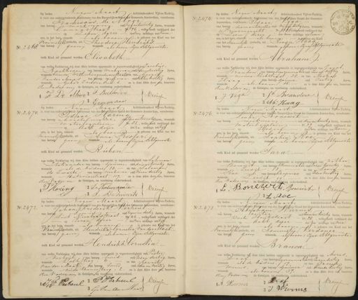 wonende als boven zijne Echtgenoote. van beroep geen welk Kind zal genaamd worden Ruben. van welke Verklaring wij deze Akte hebben opgemaakt in tegenwoordigheid van Salomon tatiaander van beroep sjomver oud drieentwintig Jaren, als de Oiders/ 83. en van Saloman„ wonende de zwarte van beroep werkman oud vierendertig Jaren, wonende Batavierstraat. 117, en is deze Akte door ons, benevens den Vaser en de Getuigen, na voorlezing onderteekend. 2.F Halwvander Koning C Driecfn „ 6 Darte No. 2.476 Op heden Negen Maart Achttienhonderd Vijfen-Tachtig is voor ons ondergeteekende Ambtenaar van den Burgerlijken Stand der Gemeente Amsterdam, verschenen: sevre, Bonewit. van beroep, werkman. oud drieentwintig Jaren, wonende materlooplein No. 27, welke heeft verklaard da teden des voor middags ten zeven ure, in het huis, staande als boven is geboren een Kind van het vrouwelijke geslacht, uit Saphia, Proe. van beroep geen wonende als boven, zijne Echtgenoote d welk Kind zal genaamd worden Sara. van welke Verklaring wij deze Akte hebben opgemaakt in tegenwoordigheid van hathan Banewit van beroep kleeremaker oud zesentwintig Jaren, wonende is Zeedijk, 83 en van zevig soe van beroep koopman oud zesenveertig Jaren, wonende Leedijk en is deze Akte door Jns, benevens den vader en de Getuigen, na voorlezing onderteekend. L. Boneger 1 A. Bonewit. Driecsen 1. .... 5 13 Rvl . 49 No. 2412 Op heden Negen Maart Achttienhonderd vyfen-Tachtig, is voor ons ondergeteekende Ambtenaar van den Burgerlijken Stand der Gemeente Amsterdam, verschenen: Johan Frederik, Vertreut Linaa oud negen en dertig Jaren, wonende van beroep Lint Nicolaasstraat No. 46, welke heeft verklaard dat op zeven dezer des voor middags ten vijf ure, in het huis, staande als boven is geboren een Kind van het vrouwelyk geslacht, uit Hendrika Cornelia Van der Saat.- van beroep gen wonende als boven; zijne Echtgenoote, 1 welk Kind zal genaamd worden Hendrika Cornelia. van welke Verklaring wij deze Akte hebben opgemaakt in tegenwoordigheid van Pieter verkeul van beroep snnd oud zesen dertig Jaren, wonende Kolkpeeg. 6. en van Gerrit van der Mart van beroep smid oud twee en veertig Jaren, wonende oude Kennissteeg, 2. en is deze Akte door ous, benevens den Vader n de Getuigen, na voorlezing onderteekend. J: P: Verkeul P Verteul Driesson 7 „ 3. G. Van der Saat No. 2.478 Op heden egen Maart Achttienhonderd Zefen-Tachttig „ is voor ons ondergetegkende Ambtenaar van den Burgerlijken Stand der Gemeente Amsterdam, verschenen: Abrahamurms. van beroep trenter oud zeven en twintig Jaren, wonende Korte Houtstraat. - No. 25., welke heeft verklaard dan op Acht dezer des na middags ten vier „ ure, in het huis, staande als baoem is geboren een Kind van het vrouwelijke geslacht, uit Kemmetje Verdoner. van beroep geen wonende alsboven, zijne Echtgenoote welk Kind zal genaamd worden Branca. van welke Verklaring w deze Akte hebben opgemaakt in tegenwoordigheid van Mozes Doof van beroep zijarenmaker oud zesendertig Jaren, wonende als de baders. 17 en van Jnsept 1 Jurms, van beroep sjamver oud tweeen dertig Jaren „ wonende als boven. 37 en is deze Akte door ons, benevens den vader in de Getuigen, na voorlezing onderteekend. 2 DOs Drieesen A Wurms 3 I W Wurms