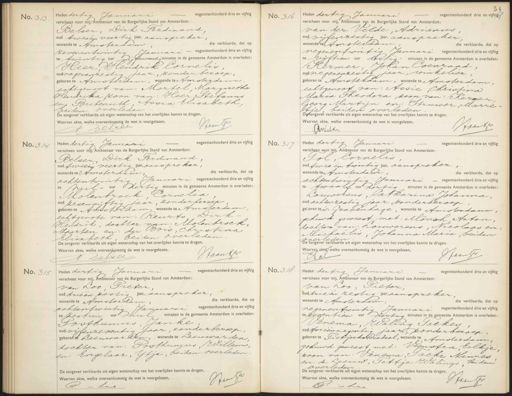 AWaelde No. 314. Heden dertig Januari negentienhonderd drie en vijftig verscheen voor mij, Ambtenaar van de Burgerlijke Stand van Amsterdam: Belser, Dirk Ferdinand oud tweeen veertig Jar, aanspreker, wonende te Amsterdam, die verklaarde, dat op achtentwintig Januari negentienhonderd drie en vijftig te nul- uur dertig munten in de gemeente Amsterdam is overleden Molenbroek, Cornelia oud zesenvijftig jaar, zonder beroep geboren te Amsterdam, wonende te Amsterdam, echtgenote van: Reurts Dirk Hendrik, dochter van: Molenbroek, Moorten en du Bois, christina Elisabeth, beiden overleden. De aangever verklaarde uit eigen wetenschap van het overlijden kennis te dragen. Waarvan akte, welke overeenkomstig de wet is voorgelezen. Haanter Eelsel No. 317. Heden dertig Januari negentienhonderd drie en viftig verscheen voor mij, Ambtenaar van de Burgerlijke Stand van Amsterdam: Sol, Cornelis oud twee en twintig Jar, aanspreker wonende te Amsterdam die verklaarde, dat op achtentwintig Januari negentienhonderd drie en vijftig te twaalf uur dertig winuten in de gemeente Amsterdam is overleden, Louwerens, Cafharina Jolanna. oud achtenzestig jaar, zonder beroep. geboren te s. Gravenlage, wonende te Amsterdam sehuwd geweest met: Mönck Anton, dochter van Louwerens, Nicolaas en Michaelis, Johanna Maria, beiden overleden. De aangever verklaarde uit eigen wetenschap van het overlijden kennis te dragen. Waarvan akte, welke overeenkomstig de wet is voorgelezen. JaanJr Be No. 315 Heden dertig Januari negentienhonderd drie en vijftig verscheen voor mij, Ammbtenaar van de Burgerlijke Stand van Amsterdam: van Zoo Pieter. oud drie en zestig Jar, aanspreker, wonende te Amsterdam die verklaarde, dat op achtentwintig Januari negentienhonderd drie en vijfgg tehlatien uur mnul minuten in de gemeente Amsterdam is overleden: Sosthumus, Janke oud vifenzeventig jaar, zonder beroep. geboren te Leeuwarden, wonende te Reuzwarden. dochter van: Tosthumus, Willem en Englaar, Yfje, beiden overleden. De aangever verklaarde uit eigen wetenschap van het overlijden kennis te dragen. Rul Waarvan akte, welke overeenkomstig de wet is voorgelezen. No. 318. Heden dertig Januari negentienhonderd drie en vijftig verscheen voor mij, Ambtenaar van de Burgerlijke Stand van Amsterdam: van 2oo, Pieter oud drie en zestig Jar, aanopreker wonende te Amsterdam, de verklaarde, dat op negenentwintig JJanuari negentienhonderd drie en vijf te zeventien uur dertig minuten in de gemeente Amsterdam is overleden Penema, Waling Iaekes oud vweeennegentig jaar, zonder beroep. geboren te Tietjerksferadeel, wonende te Amsterdam gehuwd geweest met: Veenstra Eelkje zoon van: Penema, Iacke Minnes en de Leeuw, Settje Walings, beiden overleden De aangever verklaarde uit eigen wetenschap van het overlijden kennis te dragen. Waarvan akte, welke overeenkomstig de wet is voorgelezen. Haanf