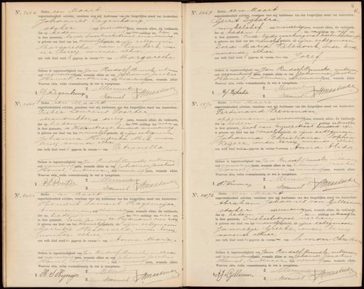No. 2462 2. Heden een Maart negentienhonderd achttien, verscheen voor mij Ambtenaar van den burgerlijken stand van Amsterdam: Johannes Degenkamp, , oud drieëndertig stoker Jaren, wonende alhier, die verklaarde „ dat op heden , des voormiddags ten tien ure, in deze gemeente, Eerste Tweelnekstraat eenentwintig, is geboren een kind van het vrouwelijk geslacht, uit zijn echtgenoote Margaretha van Nieukerk, zon- der beroep, wonende alhier, van dant Eid vort geven de vooram van Margaretha¬ Gedaan in tegenwoordigheid van Jan Rudolf Minnele ambtuari oud negenentwintaten, wonende alhier en van Johannes Jacobus Hamel, ambtinaar, oud vierentwintaren, wonende alhier Waarvan akte, welke overeenkomstig de wet is voorgelezen. Uimnte 1 3 Mi Smaalien 1 Digenkamm NHamel No. 2468 Heden een Maart negentienhonderd achttien, verscheen voor mij Ambtenaar van den burgerlijken stand van Amsterdam: Gerrit Dijkstra, winkelchef, oud eenenveertig jaren, wonende alhier, die verklaarde, des voormiddags ten vijf ure, dat op heden in deze gemeente, Oude zijds voorburg wal tweehonderd weeenvijftg is geboren een kind van het mannelijk geslacht, uit zijne echtgenoote Dord Maria Kilsdonk, zonder beroep, wonende alhier, I aan welk kind wordt gegeven de voornaan van Jozef. Gedaan in tegenwoordigheid van Jan Rudolf Munneke, ambtenaar oud negenentwint Jaren, wonende alhier en van Johannes Jacobus Hamel, ambtinaar, oud vierentwint jaren, wonende alhier. Waarvan akte, welke overeenkomstig de wet is voorgelezen. Amacteakt uk MMunen C. Dijkstra No. 2468 Heden een Maart negentienhonderd achttien, verscheen voor mij Ambtenaar van den burgerlijken stand van Amsterdam: Pieter Lourens Poorter steendrukker oud dertig jaren, wonende alhier, die verklaarde , des voor middags ten zeven ure dat op heden in deze gemeente, de Wittonstraat honderd zevenentwintig, is geboren een kind van het vrouwelijk geslacht, uit zijne echtgenoots Johanna Hendrika Mik, zonder beroep, wonende alhier; aan welk kind wordt gegeven de voornaam van Petronella. Gedaan in tegenwoordigheid van Jan Rudolf Minnuke ombtenaar oud negenentwinti jaren, wonende alhier en van Johannes Jacobus Hamel, ambtinaar, oudveerentwintig jaren, wonende alhier Waarvan akte, welke overeenkomstig de wet is voorgelezen. une 3 Mummel Fatamel Smaatucht el