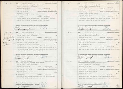 No. 16 Heden veertien november negentienhonderd achtenzestig verscheen voor mij, ambtenaar van de burgerlijke stand van Amsterdam: Meijer, Gerrit Jan, aanspreker, oud achtenvijftig jaar, wonende te Amsterdam, die verklaarde, dat op dertien november negentienhonderd achtenzestig te elf uur, veertig minuten, in de gemeente Amsterdam is overleden: Boonstra, Trijntje, oud achtenzeventig jaar, zonder beroep, geboren te Assen, wonende te Amsterdam, gehuwd geweest met: Akkerman, Jan, dochter van: Boonstra, Tjabel en: Pieters, Willemina, beiden overleden. De aangever verklaarde uit eigen wetenschap van het overlijden kennis tedragen. Waarvan akte, welke overeenkomstig de wet is voorgelezen. D Omengee No. 19 Heden veertien november negentienhonderd achtenzestig verscheen voor mij, ambtenaar van de burgerlijke stand van Amsterdam: Meijer, Gerrit Jan, aanspreker, . achtenvijftig jaar, wonende te Amsterdam, die verklaarde, dat op dertien november negentienhonderd achtenzestig te dertien uur, dertig minuten, in de gemeente Amsterdam is overleden Maurer, Jacob, zonder beroep, ou vierenzeventig jaar, geboren te Nieuwer-Amstel, wonende te Amsterdam, echtgenoot van: Pelsma, Eva, zoon van: Maurer, Johan en: Schuttel, Dievertje, beiden overleden. De aangever verklaarde uit eigen wetenschap van het overlijden kennis te dragen. Waarvan akte, welke overeenkomstig de wet is voorgelezen. Cmcpels 2 Goedgekeurd de doorhaling van drie woorden, en van nog drie woorden. Brsperef Heden veertien november negentienhonderd achtenzestig verscheen voor mij, ambtenaar van de burgerlijke stand van Amsterdam: Meijer, Gerrit Jan, aanspreker; oud achtenvijftig jaar, wonende te Amsterdam, die verklaarde, dat op dertien november negentienhonderd achtenzestig te elf uur, dertig minuten, in de gemeente Amsterdam is overleden. Doornbos, Wubbo Jacobus Willem, oud zevenenvijftig jaar, boekhouder, geboren te Amsterdam, wonende te Amsterdam, echtgenoot van: Tabak, Trijntje, zoon van: Doornbos, Klaas Pieter, keepman-wonende-te en: Hazelhoff, Everdina-beider overleden- Evertdina, beiden overleden. De aangever verklaarde uit eigen wetenschap van het overlijden keftnig te dragen. Waarvan akte, welke overeenkomstig de wet is voorgelezen.