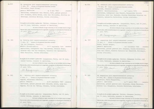 No. 853 Op zeventien juli negentienhonderd zeventig te 9 uur, 30 minuten, is in de gemeente Amsterdam overleden: Hollander, Geert Klaas, geboren te Amsterdam op 9 mei 1922, wonende te Amsterdam, echtgenoot van: Beeler, Cato, gehuwd geweest met: Klokman, Greta Betsij, zoon van: Hollander, Steffen en: Sweringa, Aeilkina Wiltina, beiden overleden. De aangifte van dit overlijden is gedaan door: Mulder, Johannes Jacobus, oud 70 jaar, bediende, wonende te Amsterdam, die tevens verklaarde uit eigen wetenschap van het overlijden kennis te dragen. Waarvan akte, welke overeenkomstig de wet is opgemaakt, voorgelezen en ondertekend te Amsterdam op 21 juli 1970. Jyetente beik No. 856. Op achttien juli negentienhonderd zeventig 17 uur, 20 minuten, is in de gemeente Amsterdam overleden. Waalwijk, Johannes Antonie, geboren te Geertruidenberg op 7 april 1918, wonende te Amsterdam, echtgenoot van: Marjot, Margaretha Gerarda Cornelia, zoon van: Waalwijk, Jacobus Hendrikus Gerardus en: Donkers, Antonetta Huiberdina, beiden overleden. De aangifte van dit overlijden is gedaan door: Langemeijer, Maria, oud 26 jaar, zonder beroep, wonende te Amsterdam, die tevens verklaarde uit eigen wetenschap van het overlijden kennis te dragen Waarvan akte, welke overeenkomstig de wet is opgemaakt, voorgelezen en ondertekend te Amsterdam op 21 juli 1970. Geikr M Langemeijer No. 854 Op twintig juli negentienhonderd zeventig te 9 uur, 32 minuten, is in de gemeente Amsterdam overleden: van der Genugten, Jannetje, geboren te Nieuwer-Amstel op 11 september 1916, wonende te Amstelveen, echtgenote van: van Setten, Hendrik Frans, dochter van: van der Genugten, Cornelis en: Spaargaren, Anna Christina, beiden overleden. De aangifte van dit overlijden is gedaan door: Langemeijer, Maria, oud 26 jaar, zonder beroep, wonende te Amsterdam, die tevens verklaarde uit eigen wetenschap van het overlijden kennis te dragen. Waarvan akte, welke overeenkomstig de wet is opgemaakt, voorgelezen en ondertekend te Amsterdam op 21 Juli 1970. beider H JM. Langemeijer No. 857 Op negentien juli negentienhonderd zeventig te 10 uur, 0 minuten, is in de gemeente Amsterdam overleden: Beker, Gerard Rutger, geboren te Amsterdam op 3 november 1908, wonende te Amsterdam, gehuwd geweest met: Zutphen, Jacoba Wilhelmina, zoon van: Beker, Hendrik Cornelis en: Demoitië, Willempje, beiden overleden. De aangifte van dit overlijden is gedaan door: Mulder, Johannes Jacobus, oud 70 jaar, bediende, wonende te Amsterdam, die tevens verklaarde uit eigen wetenschap van het overlijden kennis te dragen Waarvan akte, welke overeenkomstig de wet is opgemaakt, voorgelezen en ondertekend te Amsterdam op 27 Juli 79 Gbeikr 4JMauter 9 No. 855 Op twintig juli negentienhonderd zeventig te 4 uur, 0 minuten, is in de gemeente Amsterdam overleden: Eggink, Wilhelmus Johannes, geboren te Zutphen op 25 september 1887, wonende te Amsterdam, gehuwd geweest met: Brouwer, Alida, zoon van: Eggink, Willem en: Uijting, Johanna, beiden overleden. De aangifte van dit overlijden is gedaan door: Langemeijer, Maria, oud 26 jaar, zonder beroep, wonende te Amsterdam, die tevens verklaarde uit eigen wetenschap van het overlijden kennis te dragen. Waarvan akte, welke overeenkomstig de wet is opgemaakt, voorgelezen en ondertekend te Amsterdam op 21 juli 1970. erke mujen No. 858 Op negentien juli negentienhonderd zeventig te 16 uur, 30 minuten, is in de gemeente Amsterdam overleden: Kampmeijer, Maria Margaretha, geboren te Amsterdam op 11 april 1893, wonende te Amsterdam, gehuwd geweest met: Geurtsen, Johan Theodoor, dochter van: Kampmeijer, Gerarda Christina, overleden. De aangifte van dit overlijden is gedaan door: Mulder, Johannes Jacobus, oud 70 jaar, bediende, wonende te Amsterdam, die tevens verklaarde uit eigen wetenschap van het overlijden kennis te drage. Waarvan akte, welke overeenkomstig de wet is opgemaakt, voorgelezen en ondertekend te Amsterdam op 21 juli 1970. Zinte J Veuler 1