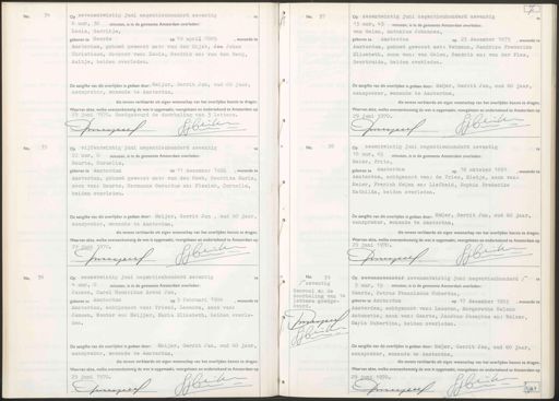 34 No. Op zevenentwintig juni negentienhonderd zeventig te 6 uur, 30 minuten, is in de gemeente Amsterdam overleden: Loois, Gerritje, geboren te Heerde op 19 april 1885, wonende te Amsterdam, gehuwd geweest met: van der Rijst, Jea Johan Christiaan, dochter van: Loois, Hendrik en: van den Berg, Aaltje, beiden overleden. De aangifte van dit overlijden is gedaan door: Meijer, Gerrit Jan, oud 60 jaar, aanspreker, wonende te Amsterdam, die tevens verklaarde uit eigen wetenschap van het overlijden kennis te dragen. Waarvan akte, welke overeenkomstig de wet is opgemaakt, voorgelezen en ondertekend te Amsterdam op 29 juni 1970. Goedgekeurd de doorhaling van 3 letters. u Gb pregec No. 37 Op zesentwintig juni negentienhonderd zeventig 13 uur, 45 minuten, is in de gemeente Amsterdam overleden: van Galen, Antonius Johannes, geboren te Amsterdam op 23 december 1875, wonende te Amsterdam, gehuwd geweest met: Wehmann, Hendrika Frederika Elisabeth, zoon van: van Galen, Hendrik en: van der Plas, Geertruida, beiden overleden. De aangifte van dit overlijden is gedaan door: Meijer, Gerrit Jan, oud 60 jaar, aanspreker,, wonende te Amsterdam, die tevens verklaarde uit eigen wetenschap van het overlijden kennis te dragen Waarvan akte, welke overeenkomstig de wet is opgemaakt, voorgelezen en ondertekend te Amsterdam op 29 juni 1970. ibeiker Sprngecs 80 Op vijfentwintig juni negentienhonderd zeventig te 22 uur, 0 minuten, is in de gemeente Amsterdam overleden: Reurts, Cornelis, op 11 december 1886, wonende te geboren te Amsterdam Amsterdam, gehuwd geweest met: van den Hoek, Hendrika Maria, zoon van: Reurts, Hermanus Gerardus en: Plazier, Cornelia, beiden overleden. De aangifte van dit overlijden is gedaan door: Meijer, Gerrit Jan , oud 60 jaar, aanspreker, wonende te Amsterdam, die tevens verklaarde uit eigen wetenschap van het overlijden kennis te dragen. Waarvan akte, welke overeenkomstig de wet is opgemaakt, voorgelezen en ondertekend te Amsterdam op 19 juni 1970. Gibenk smeyjeus 38 No. Op zesentwintig juni negentienhonderd zeventig
